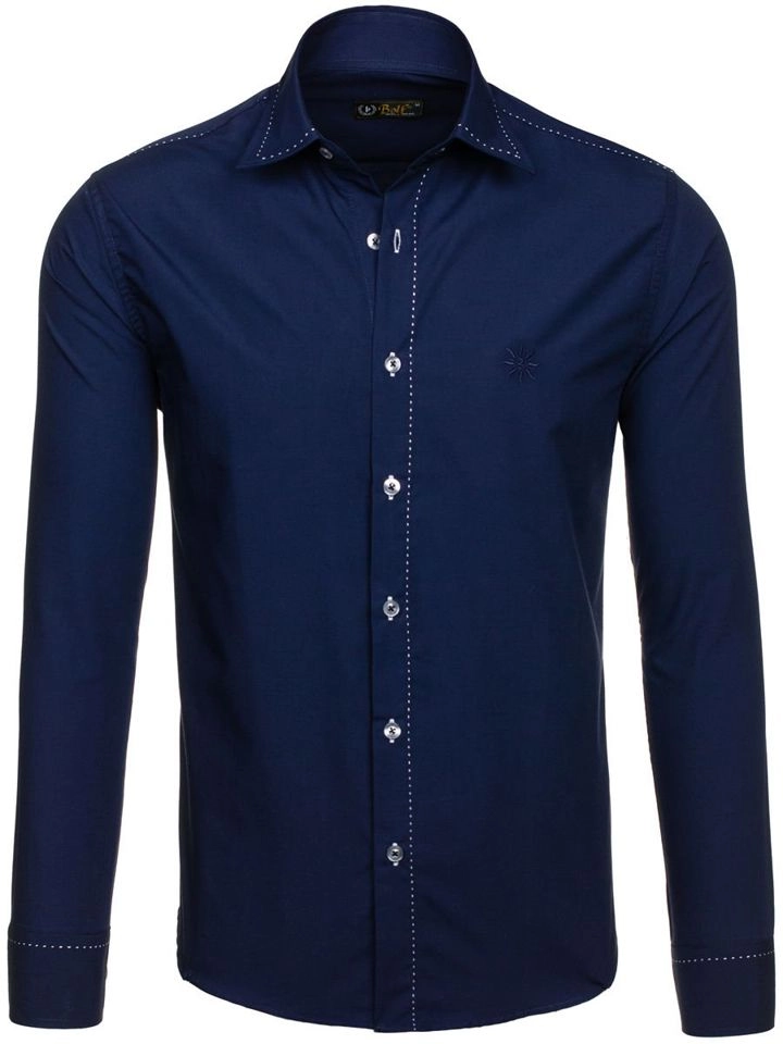 Minimalistiska, eleganta Bolf herrskjortor i en neutral marinblå färg. Perfekt för jobbet, de passar bra i mindre formella kläder. Den slim fit marinblå långärmade skjortan har en snygg haikrage som framhäver figuren perfekt. Subtila sömmar ger den charm.
