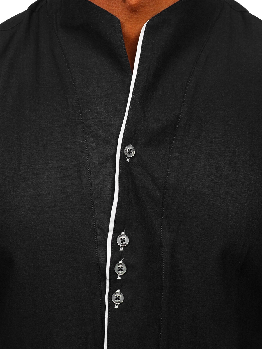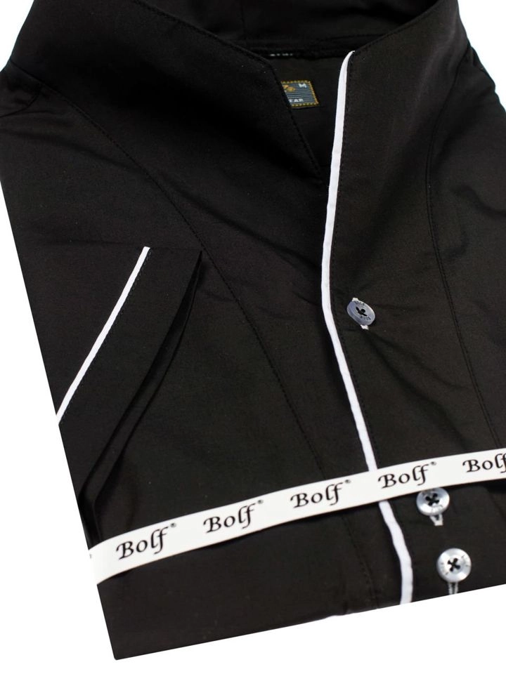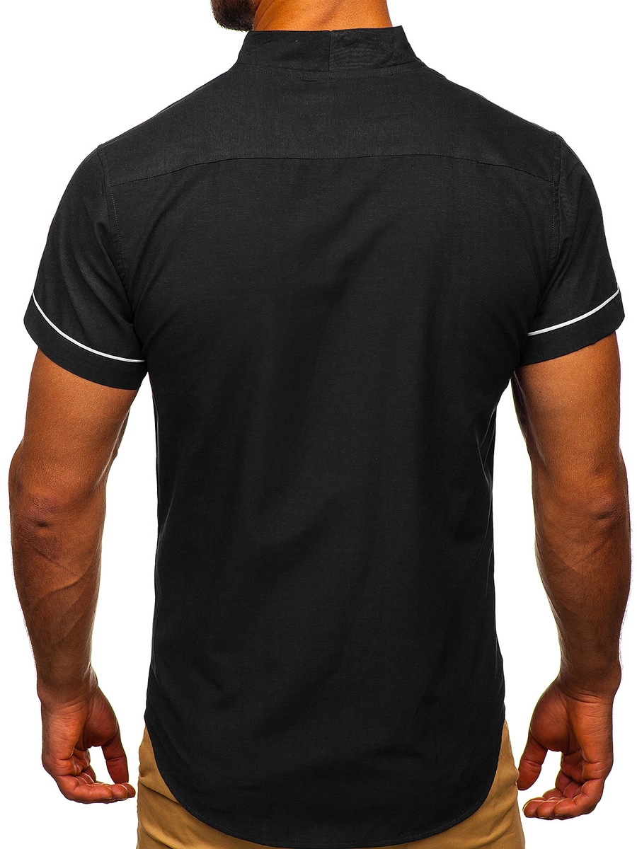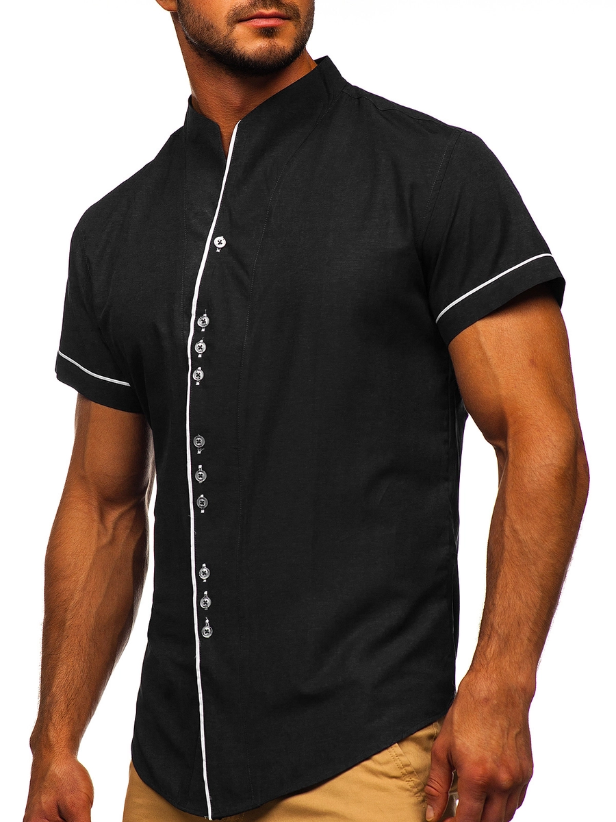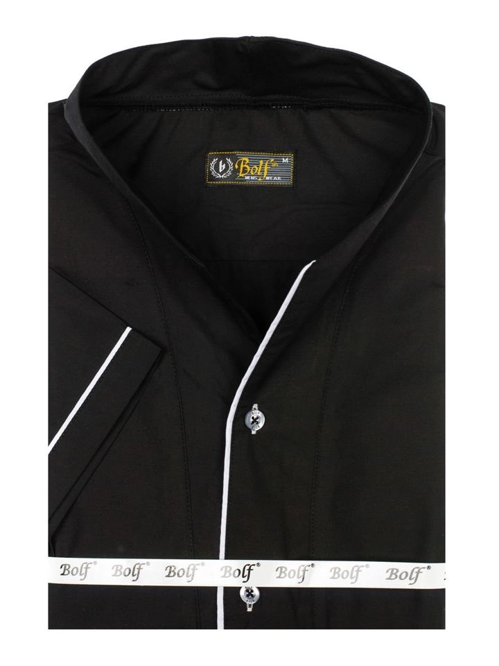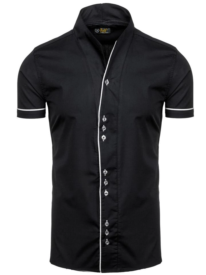 Bekväm svart kortärmad herrskjorta från Bolfs kollektion. Istället för en klassisk krage har den en ståkrage vilket förstärker den manliga kroppsformen väldigt väl. Den här slim fit-skjortan passar utmärkt till vardags under sommaren. Använd gärna med jeans, chinos eller shorts.