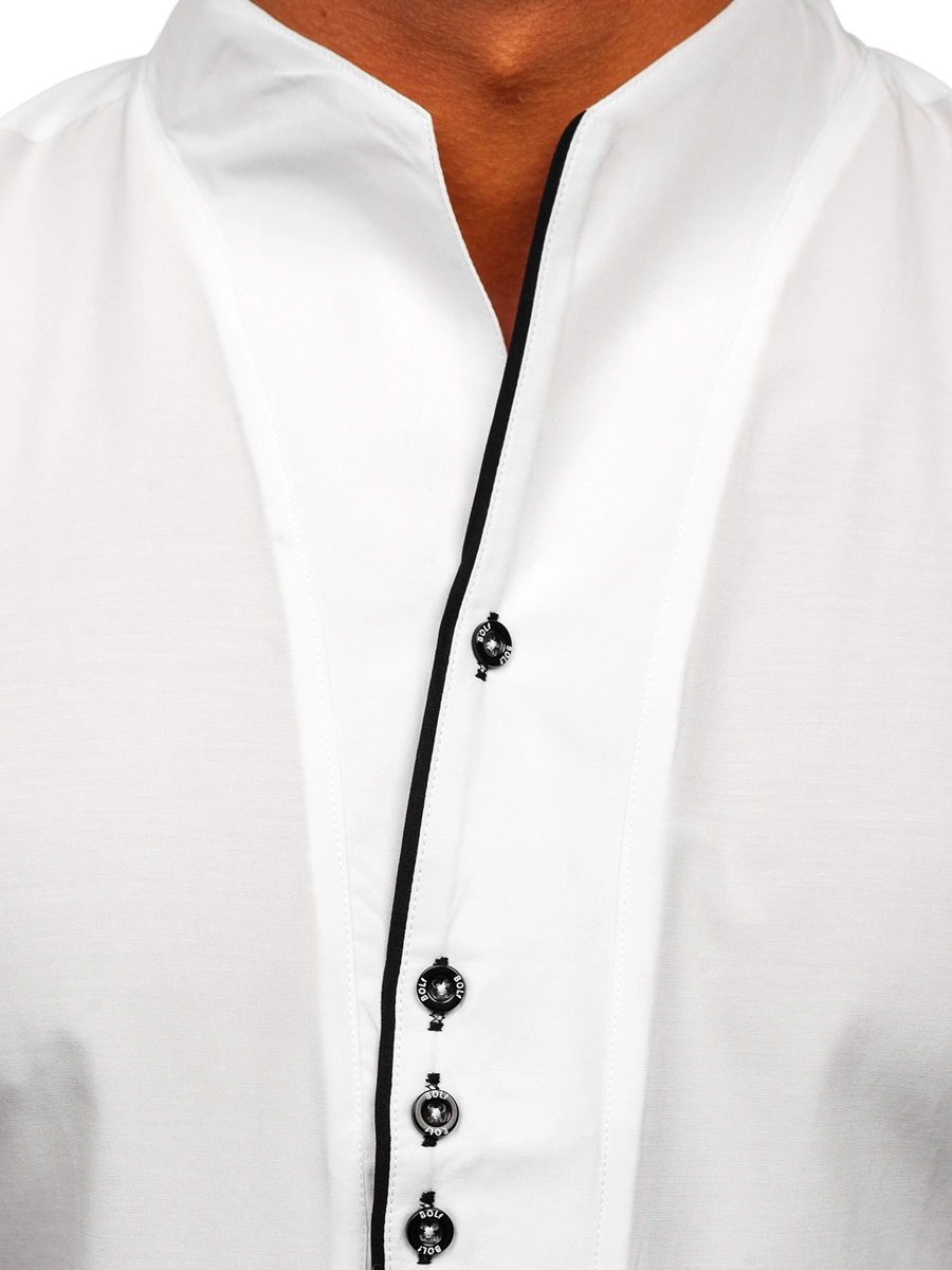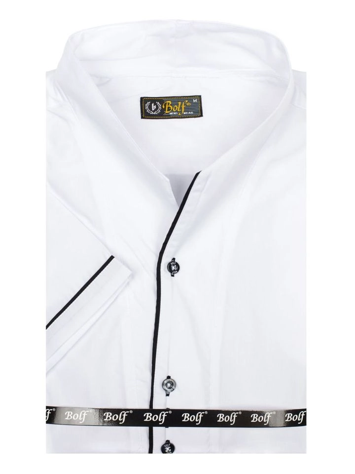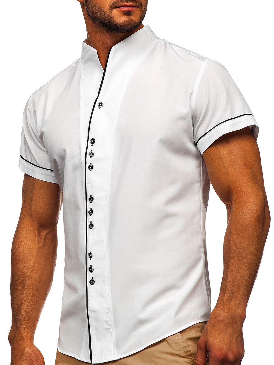 Bekväm vit kortärmad herrskjorta från Bolfs kollektion. Istället för en klassisk krage har den en ståkrage vilket förstärker den manliga kroppsformen väldigt väl. Den här slim fit-skjortan passar utmärkt till vardags under sommaren. Använd gärna med jeans, chinos eller shorts.