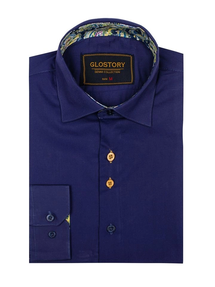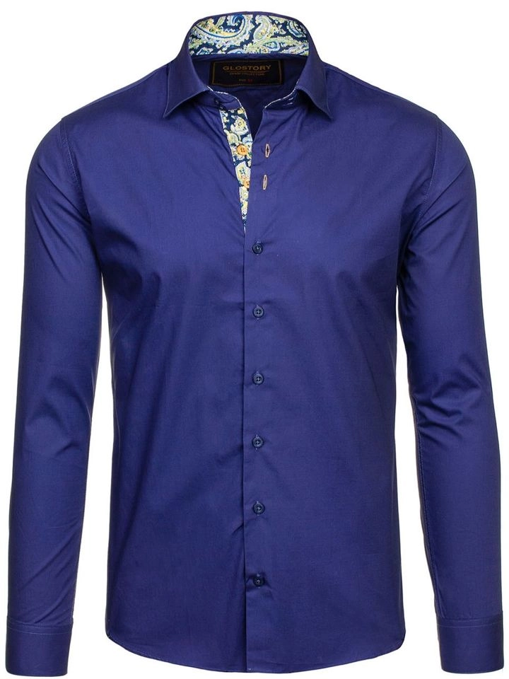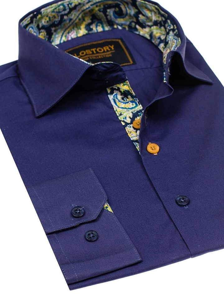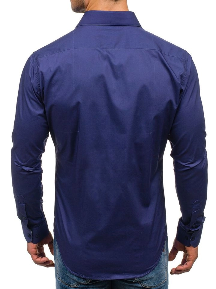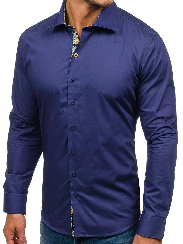 Snygg marinblå herrskjorta från Bolf-kollektionen. Perfekt i ett set med en jacka eller i en duett med jeans. En marinblå långärmad skjorta med smal passform ser bra ut utan slips. Lossa bara kragen och visa upp paisleyknappslåen för att liva upp looken.