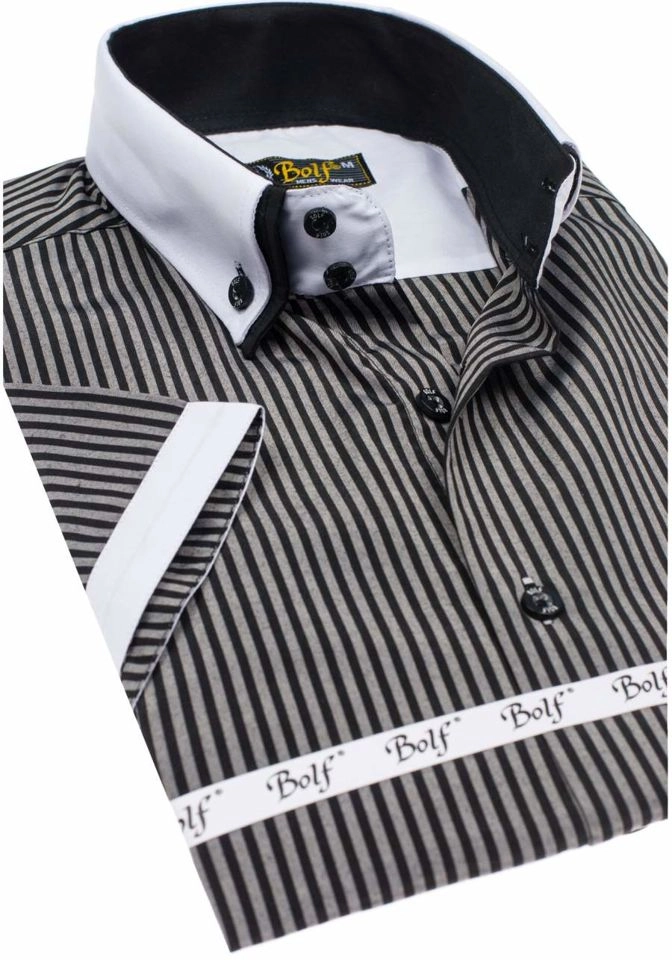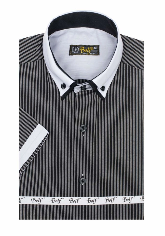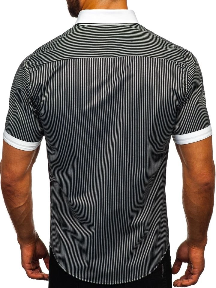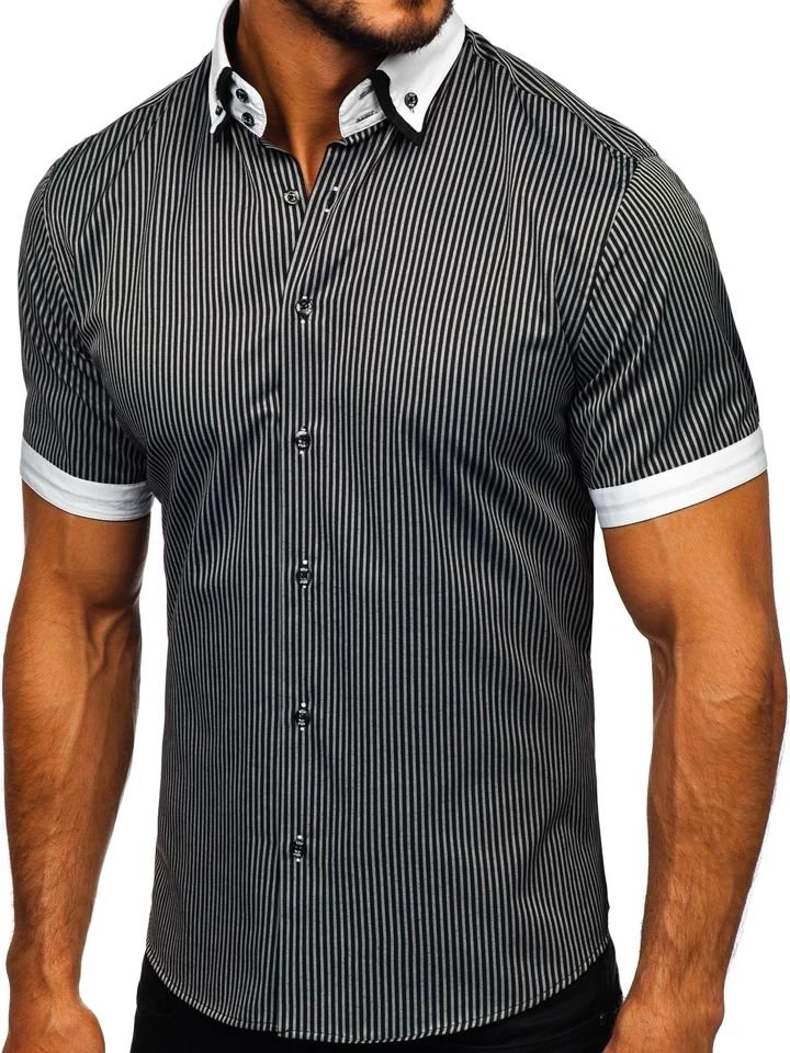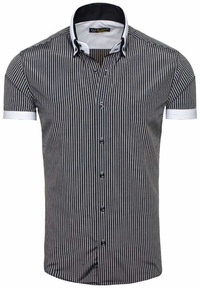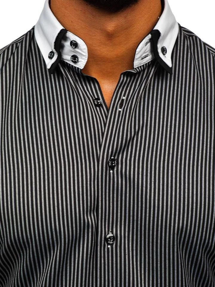 Bekväm svart slim fit skjorta för män från Bolf-kollektionen. Lämplig för informella stilar, pålitlig på våren och sommaren. Den presenterade modellen har delikata ränder och en vit krage. Den ser snygg ut med jeans, sneakers eller en lös kofta.