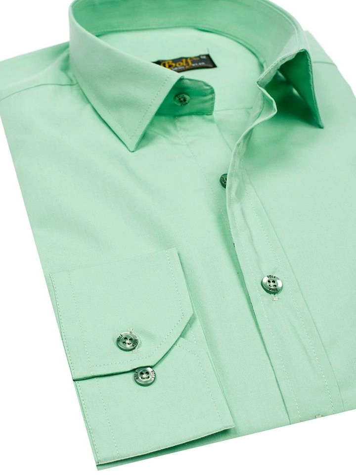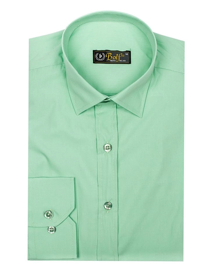 Elegant mintgrön långärmad herrskjorta 1703 från Bolfs Kollektion. Den här modellen finns i flera olika färger. Enfärgade herrskjortor rekommenderas till de som gillar minimalism och klassisk elegans i modet. Den är bekväm och har bra passform. Defenitivt ett måste i den medvetna affärsmannens garderob. Designen är rak och passar till olika stilar. Skjortan är av slim fit-modell, har knappar och är praktiskt rundad nertill. Ärmarns avslutas med en bred, justerbar manschett som stängs med en knapp. Den har en klassisk krage med korta slag.
