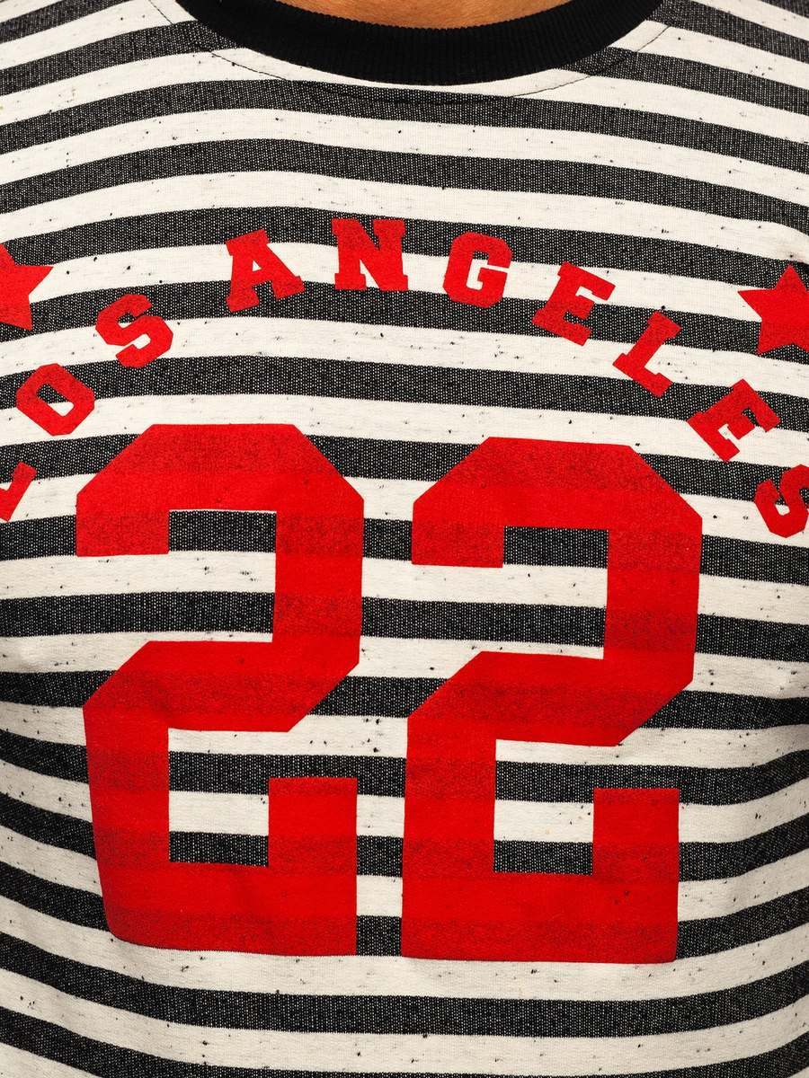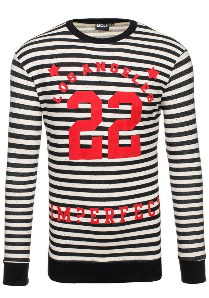 Randig herrtröja från Bolf är det perfekta plagget för gymmet och imponerande element i streetwear-outfit. Universellt snitt i tonade färger. Svarta och vita ränder med röda tryck ger en intressant effekt. Passar bra tillsammans med jeans, shorts eller cargobyxor. Matchar perfekt med trendiga röda skor.