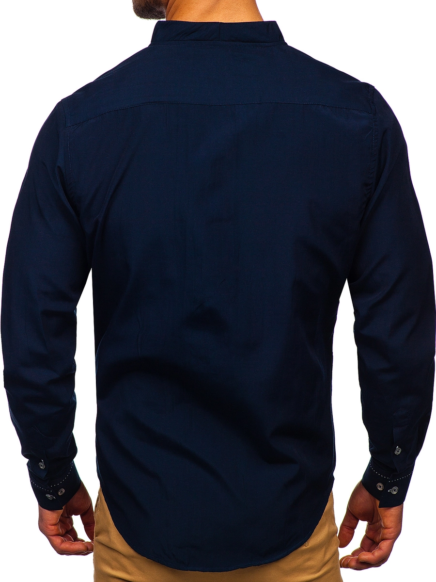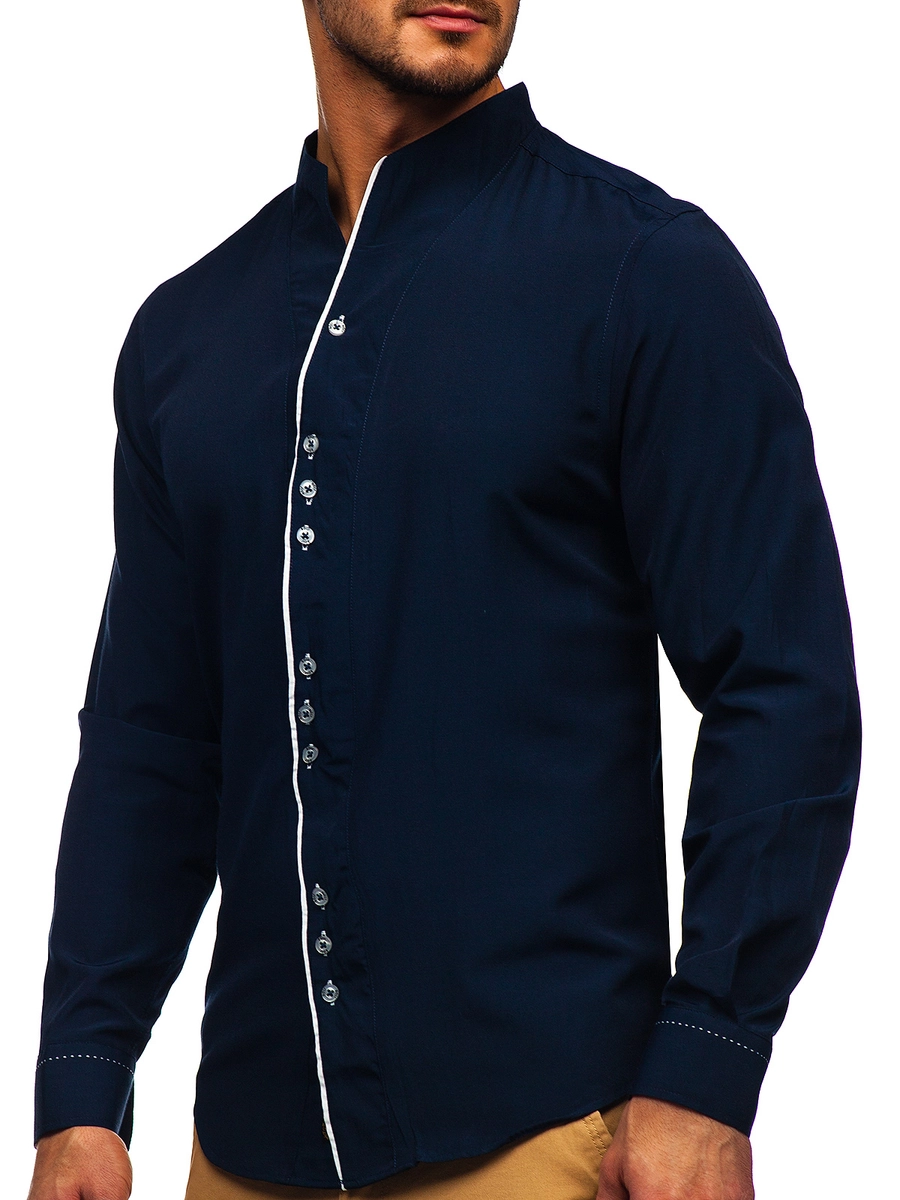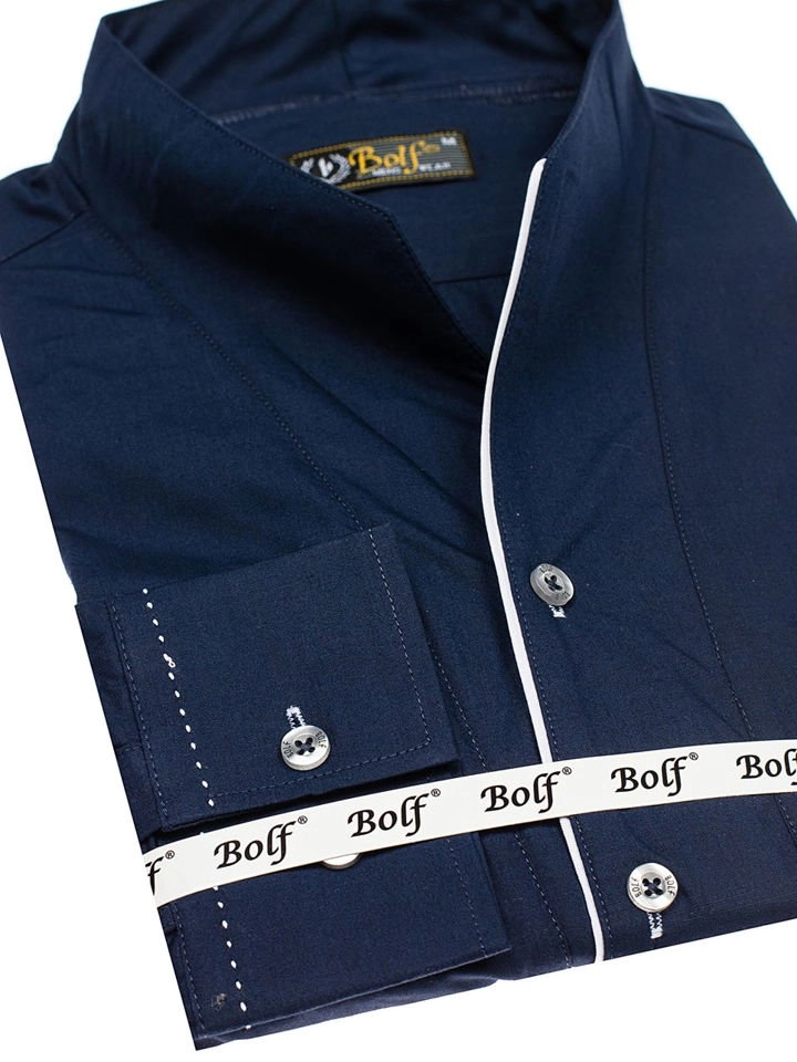 Vacker marinblå herrskjorta med smal passform från Bolf-kollektionen. Den har en praktisk krage. Knappraden är fint markerad. Den här långärmade modellen har en slimmande effekt. Passar många olika stilar.