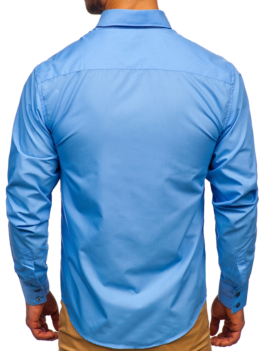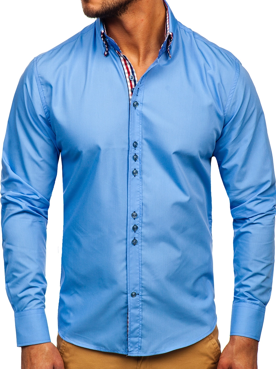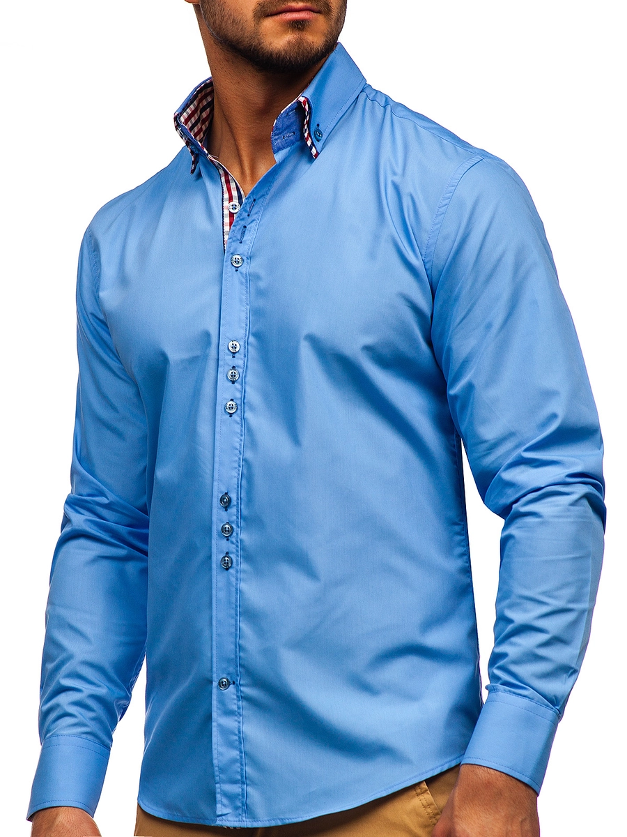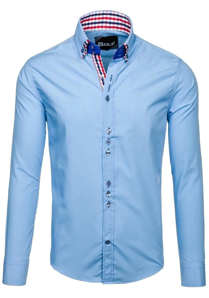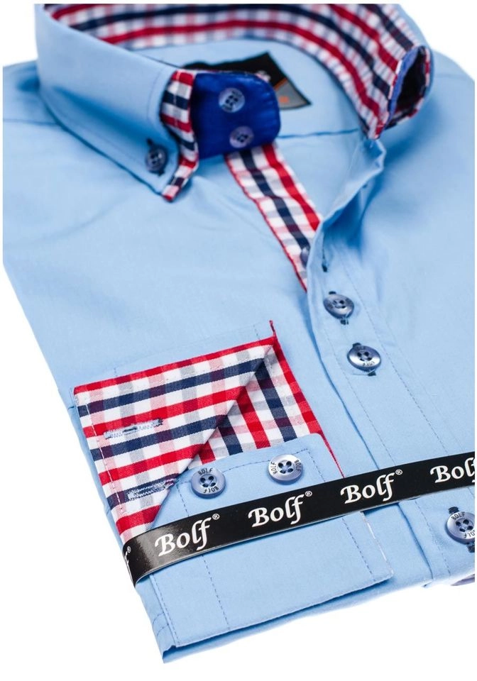 Moderiktiga och snygga himmelsblå långärmade skjortor från Bolf. Den himmelsblå modellen kännetecknas av en vacker färg, mycket imponerande dubbel button-down krage och rutiga inlägg. Denna skjorta slankar kroppen, är välsittande och mycket bekväm. Matcha den gärna med en kavaj, jeans eller chinos.