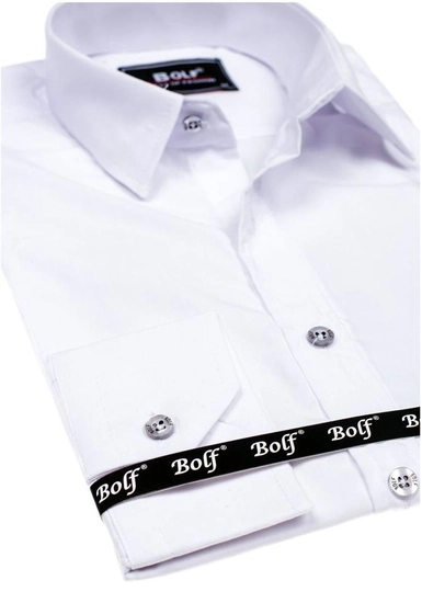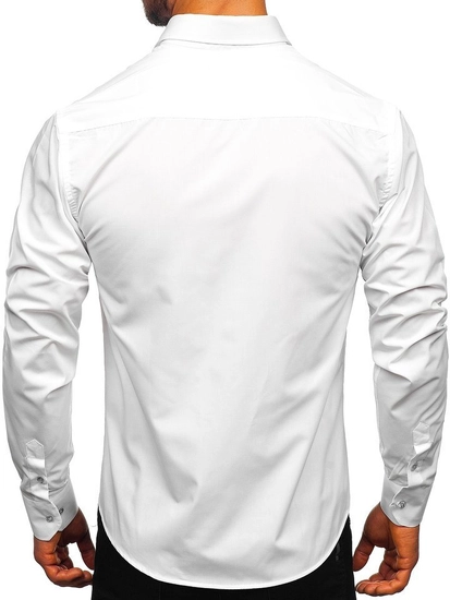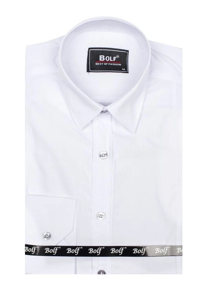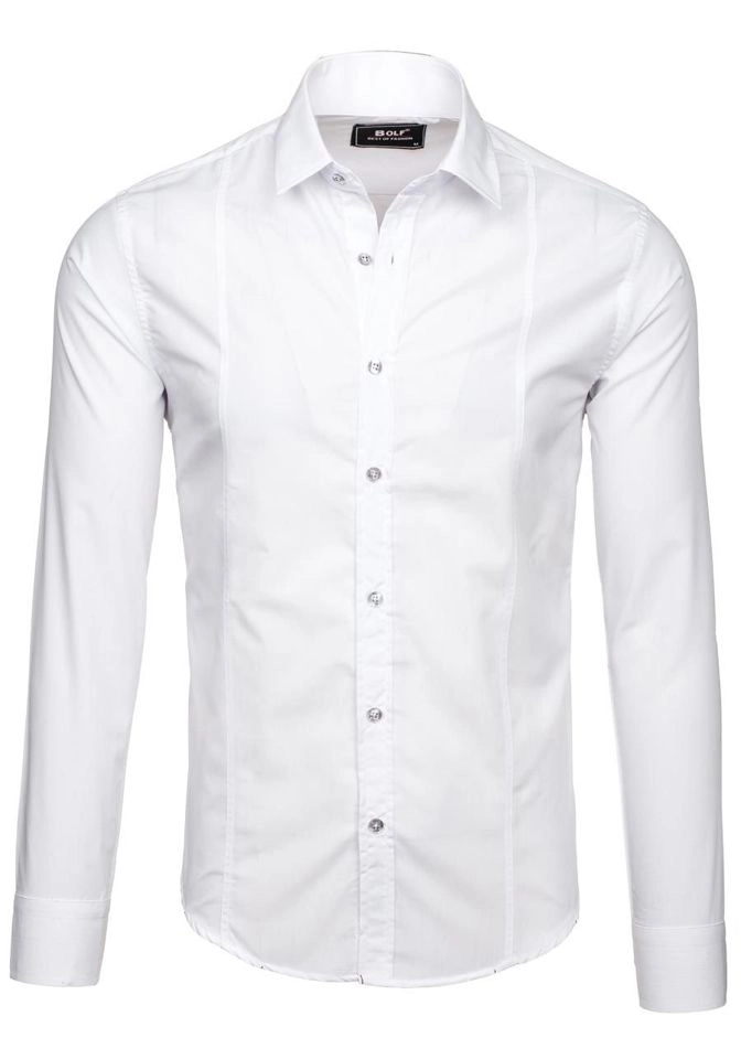 Enkel vit slim fit-skjorta för män med klassisk krage från Bolf-kollektionen. Du kan matcha den med en skjorta och en slips såväl som i lediga outfits. Den presenterade modellen är också utrustad med en neutral färg och understryker axlarna. Det är ett måste.
