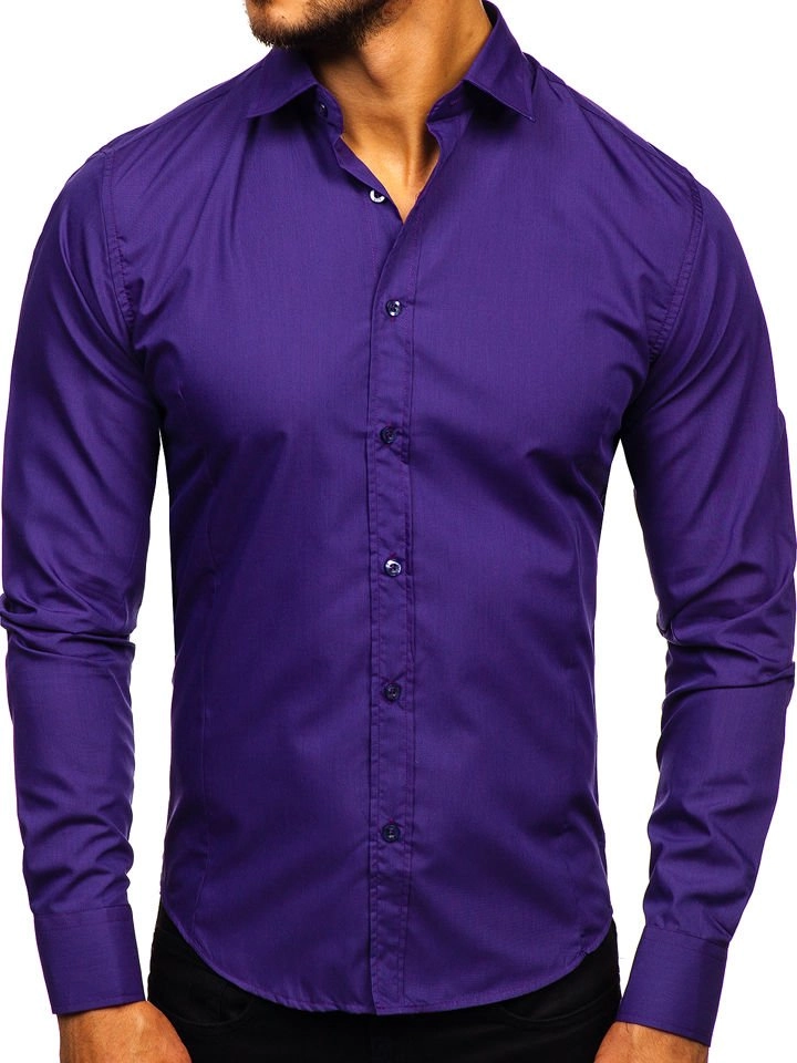 Elegant violett långärmad herrskjorta 1703 från Bolfs Kollektion. Den här modellen finns i flera olika färger. Enfärgade herrskjortor rekommenderas till de som gillar minimalism och klassisk elegans i modet. Den är bekväm och har bra passform. Defenitivt ett måste i den medvetna affärsmannens garderob. Designen är rak och passar till olika stilar. Skjortan är av slim fit-modell, har knappar och är praktiskt rundad nertill. Ärmarns avslutas med en bred, justerbar manschett som stängs med en knapp. Den har en klassisk krage med korta slag.