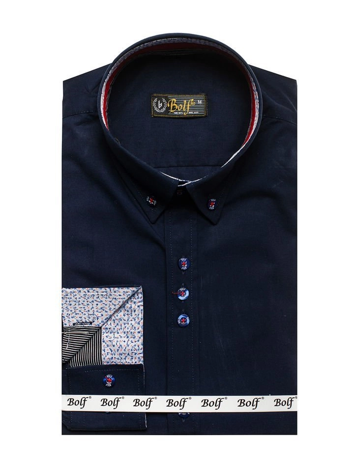 Klassisk och elegant marinblå herrskjorta från Bolf-kollektionen. Den är ett fantastiskt val till flera olika stilar. Modellen har slim fit passform och har button down krage. IDen har även bekväm knäppning. Använd gärna tillsammans med ett par jeans och en kavaj.