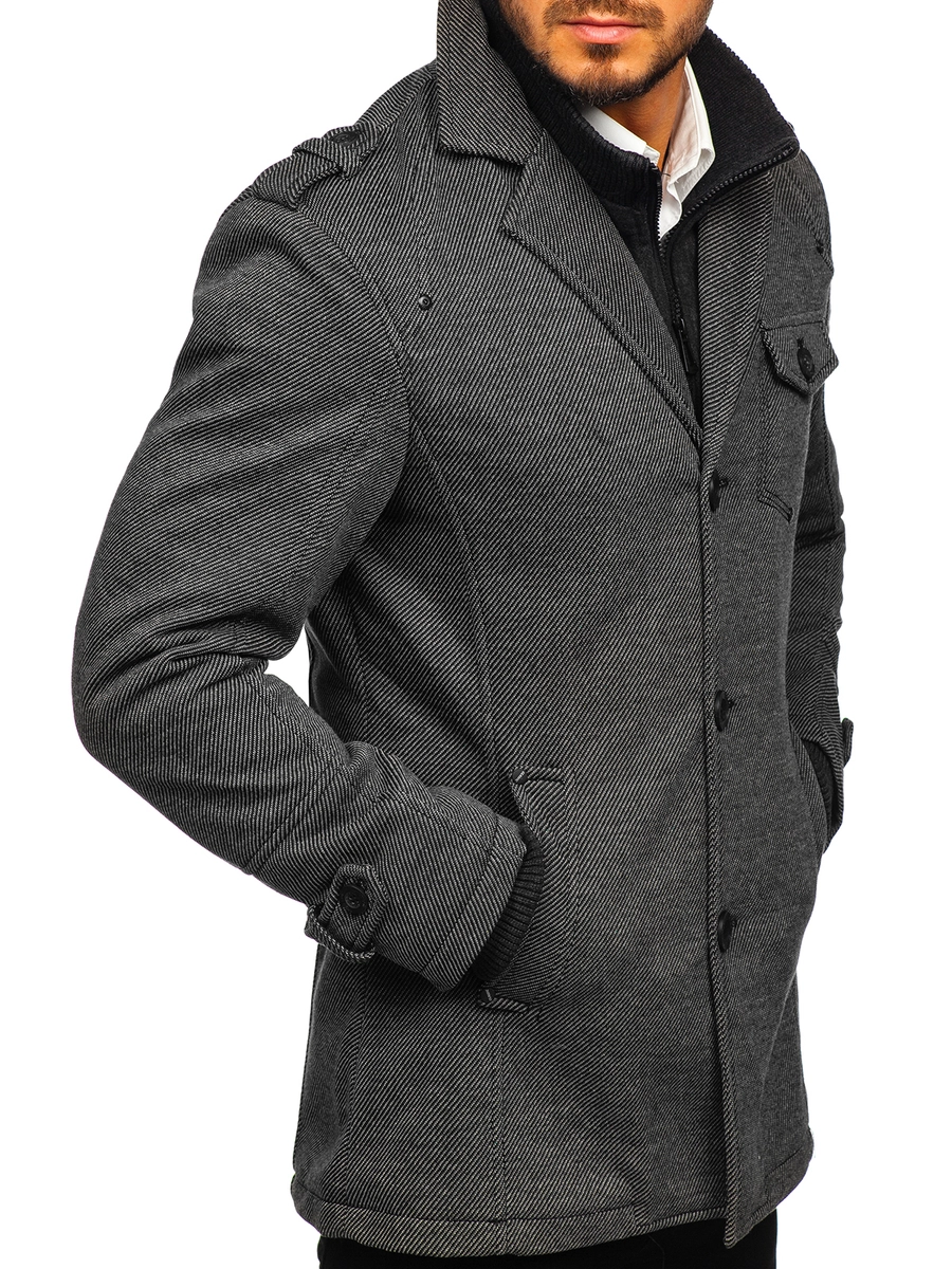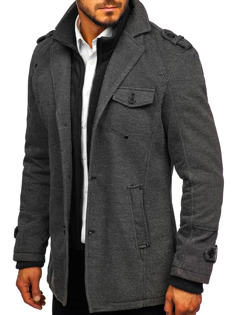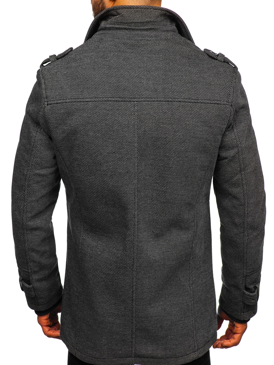 Väldigt elegant grå enkelkbröstad herrrock. Den är fodrad, har dubbel knäppning, ytterligare en krage och epauletter på axlar och armbågar. Den här modellen från Bolfs kollektion passar utmärkt till flera olika stilar. Använd gärna tillsammans med ett par jeans och en tröja.