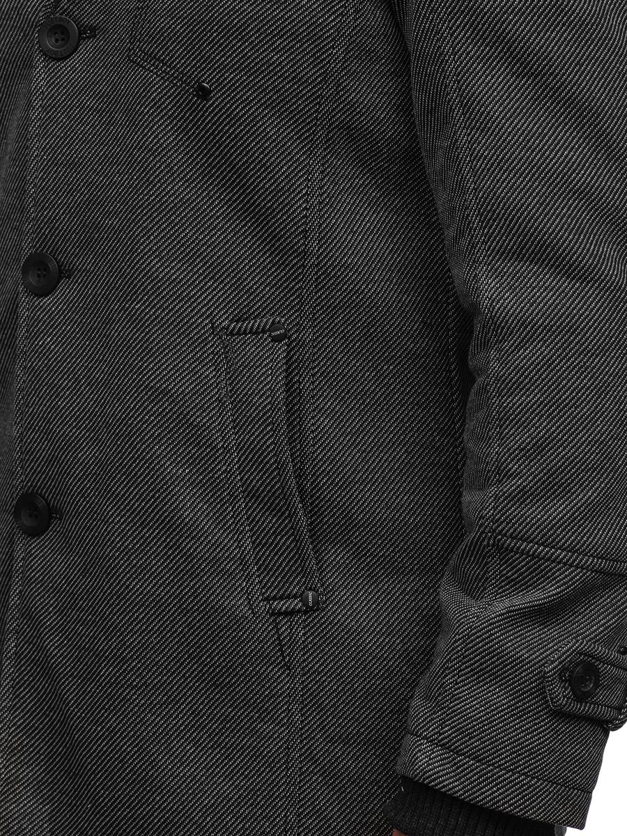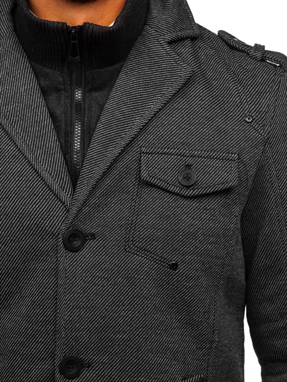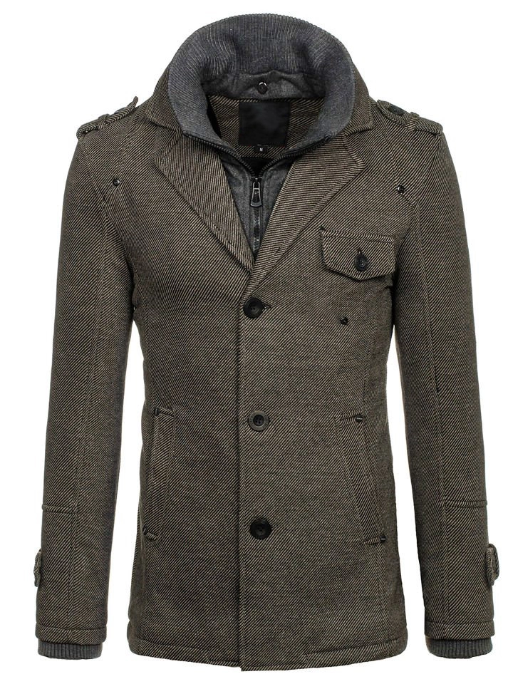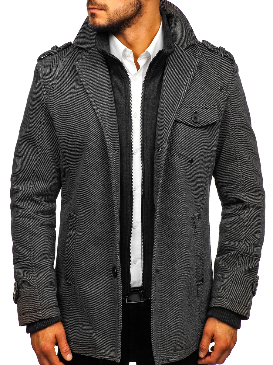 Väldigt elegant grå enkelkbröstad herrrock. Den är fodrad, har dubbel knäppning, ytterligare en krage och epauletter på axlar och armbågar. Den här modellen från Bolfs kollektion passar utmärkt till flera olika stilar. Använd gärna tillsammans med ett par jeans och en tröja.