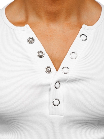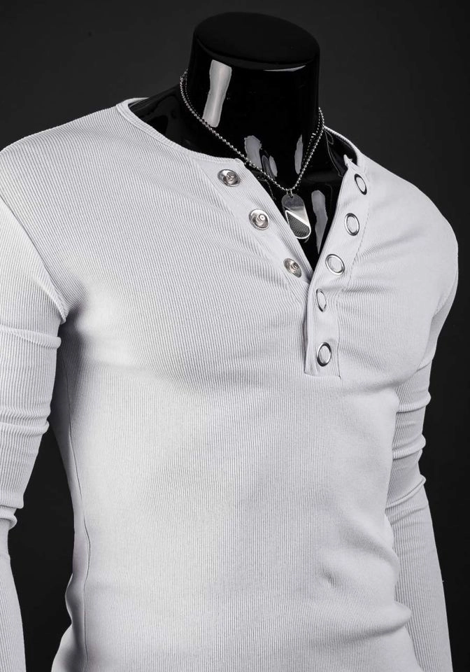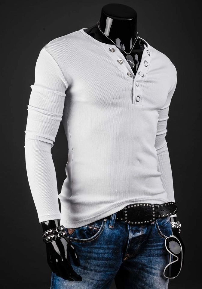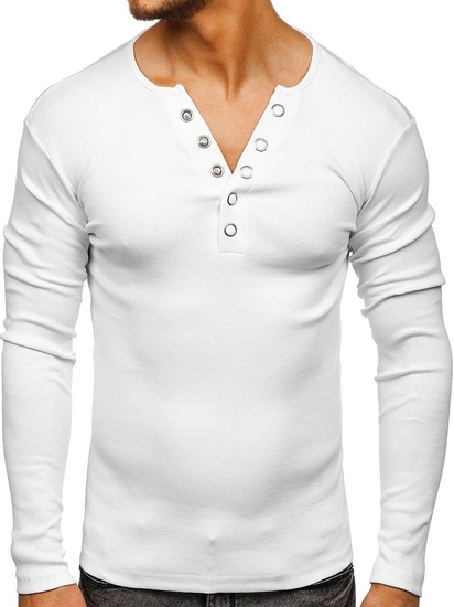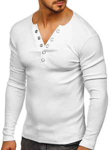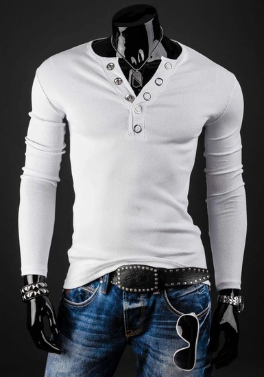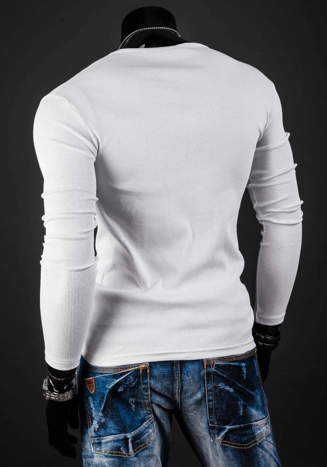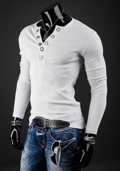 Basic vit långärmad topp för vardagsbruk. Det är tillverkat av mjukt randigt material och har snäpp i halsringningen. Den presenterade modellen från Bolf-kollektionen kan kombineras snyggt med ett par jeans, chinos eller joggers. Bär den tillsammans med en kavaj, jacka eller sweatshirt.