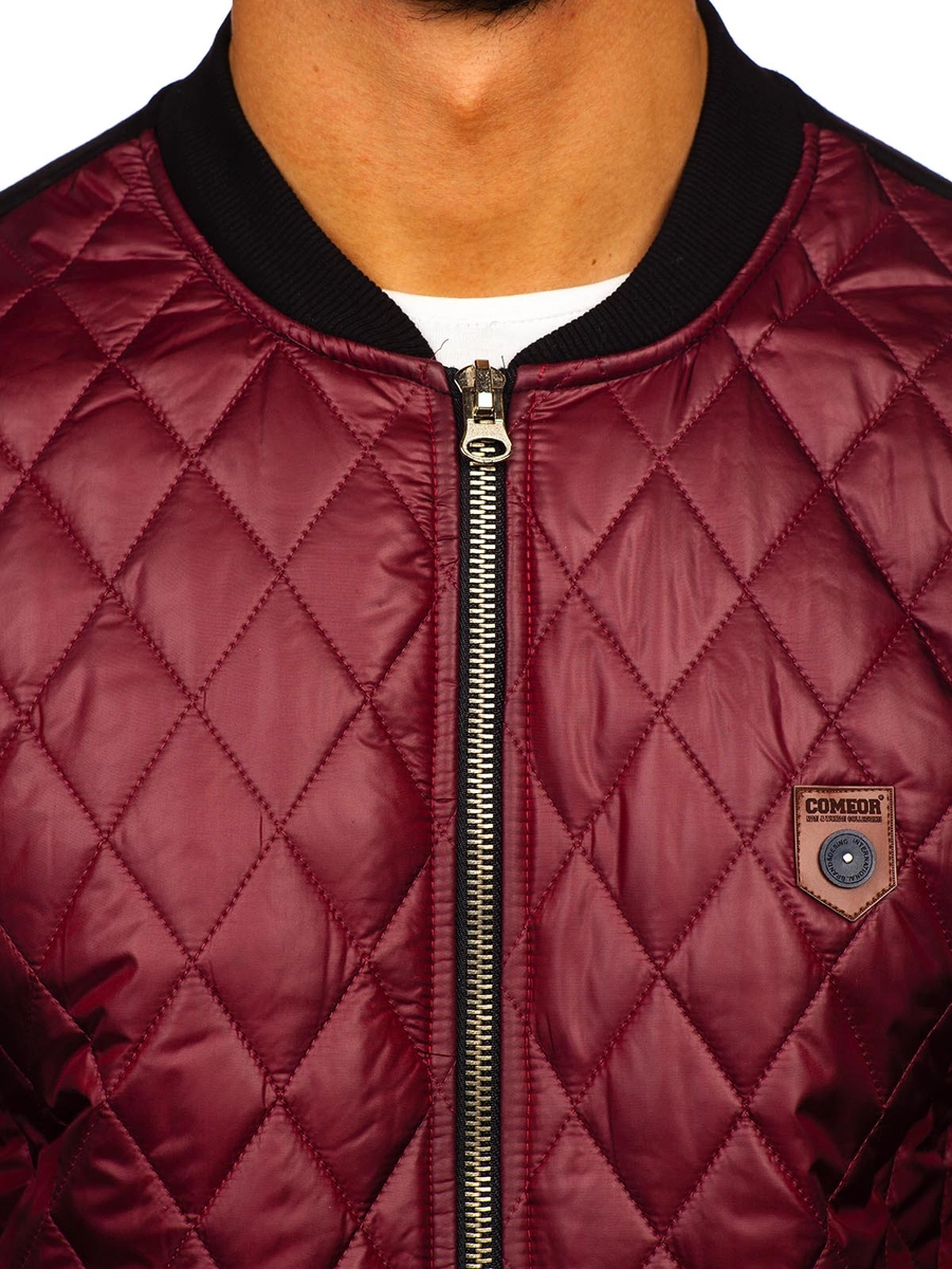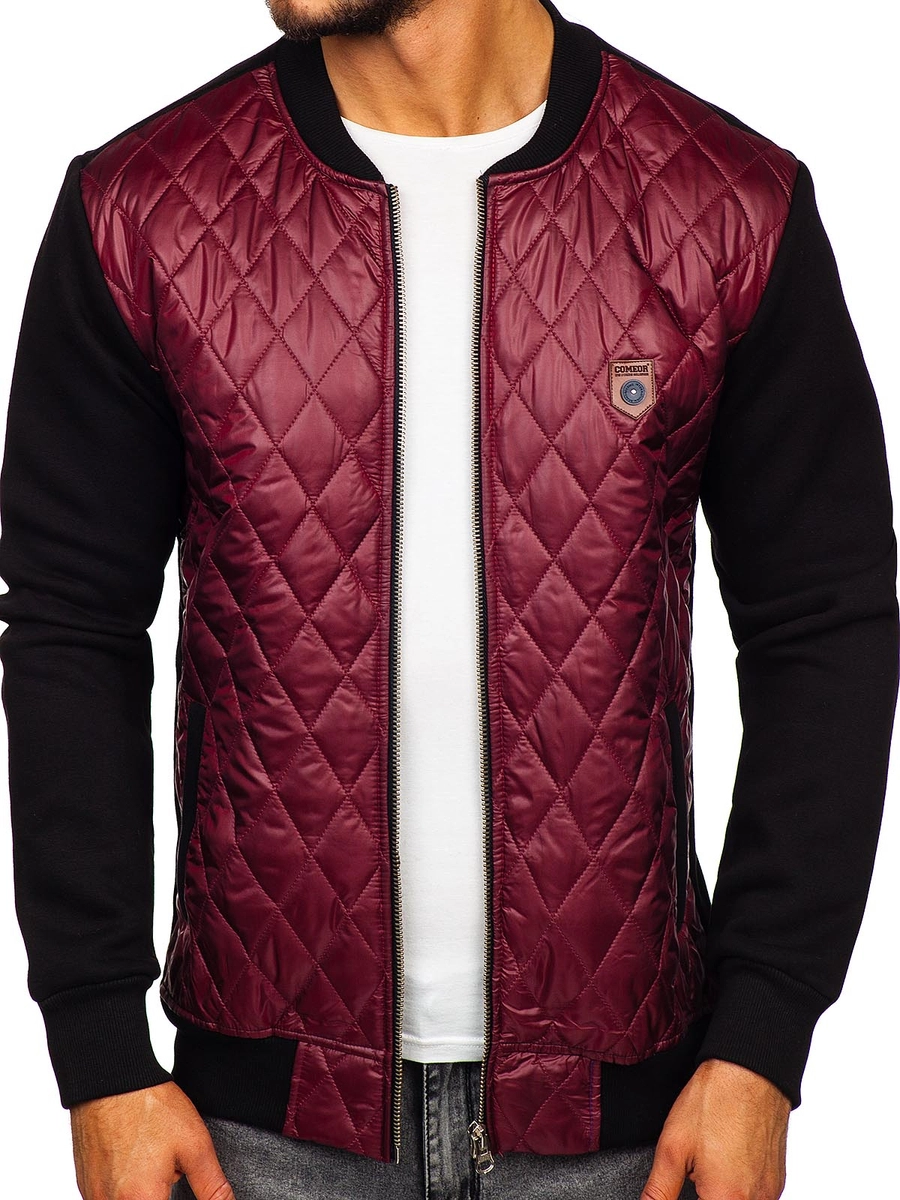 Användbar vinröd övergångsbomberjacka från Bolf kollektionen. Den har quiltning, kontrasterande ärmar och inslag framtill. Passar jättebra till hösten. Använd gärna till en elegantare stil.