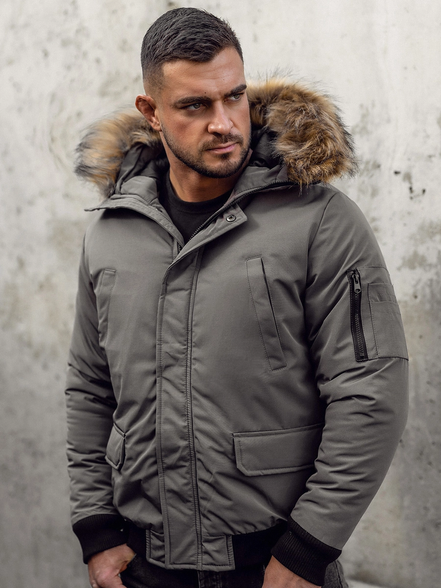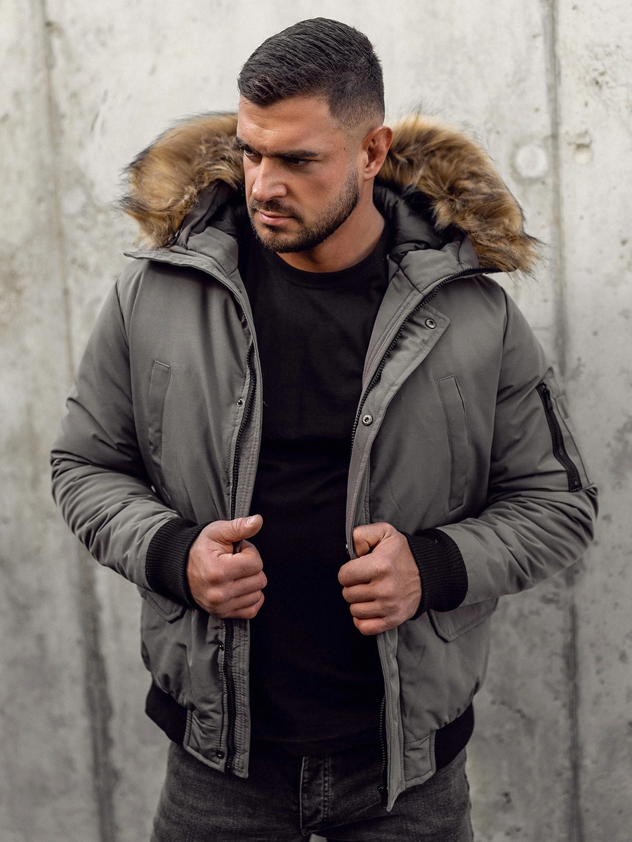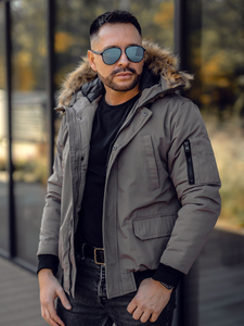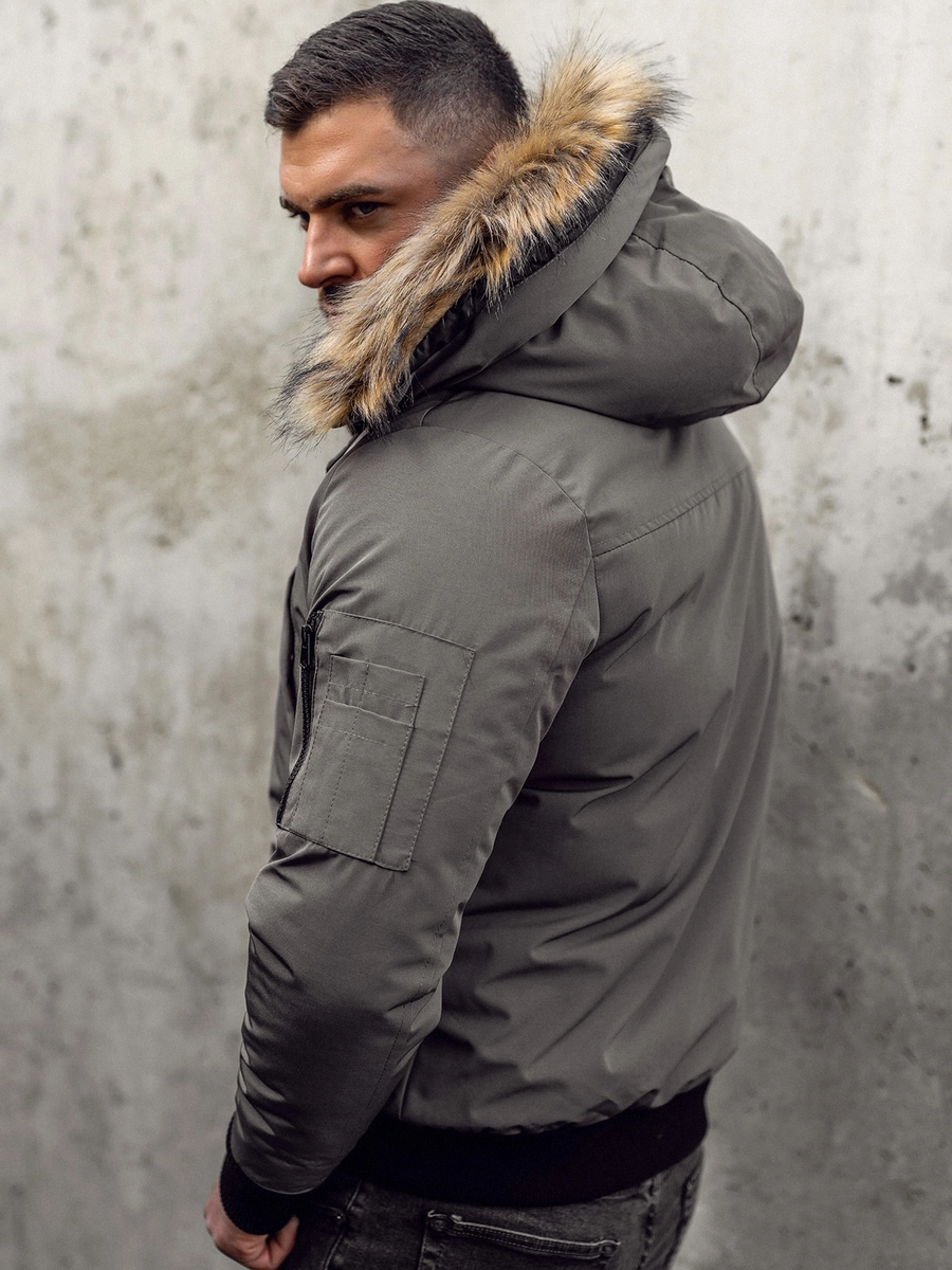 Grafitgrå vinterjacka med många fickor och dekorativ pälshuva från Bolf kollektionen. Bekväm, snäppfickor. Passar perfekt till vardagen. Bär den tillsammans med en sweatshirt och jeans eller joggers.