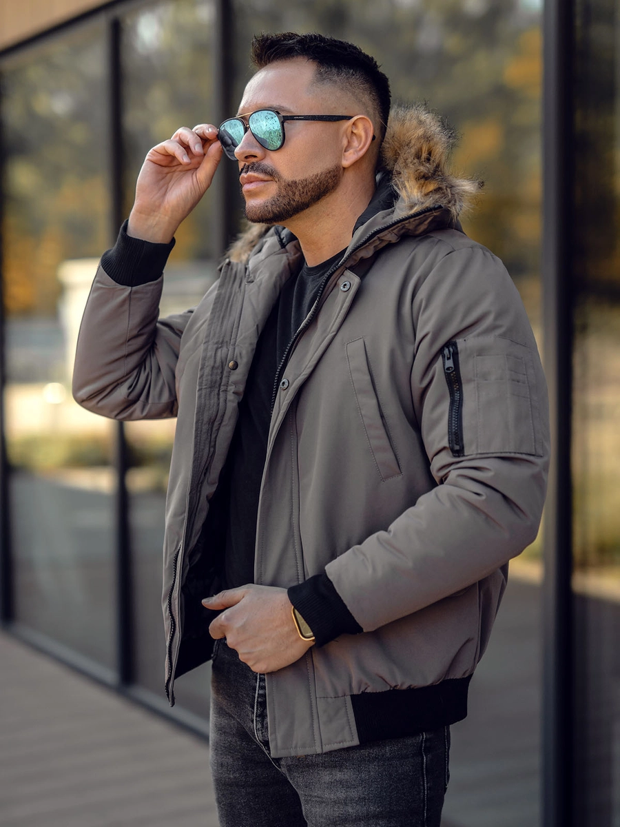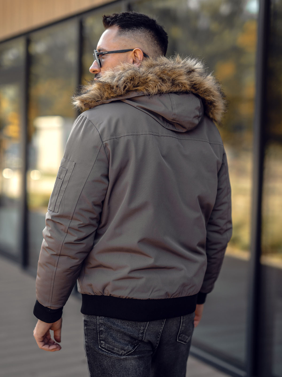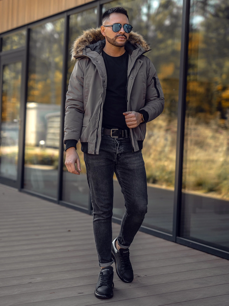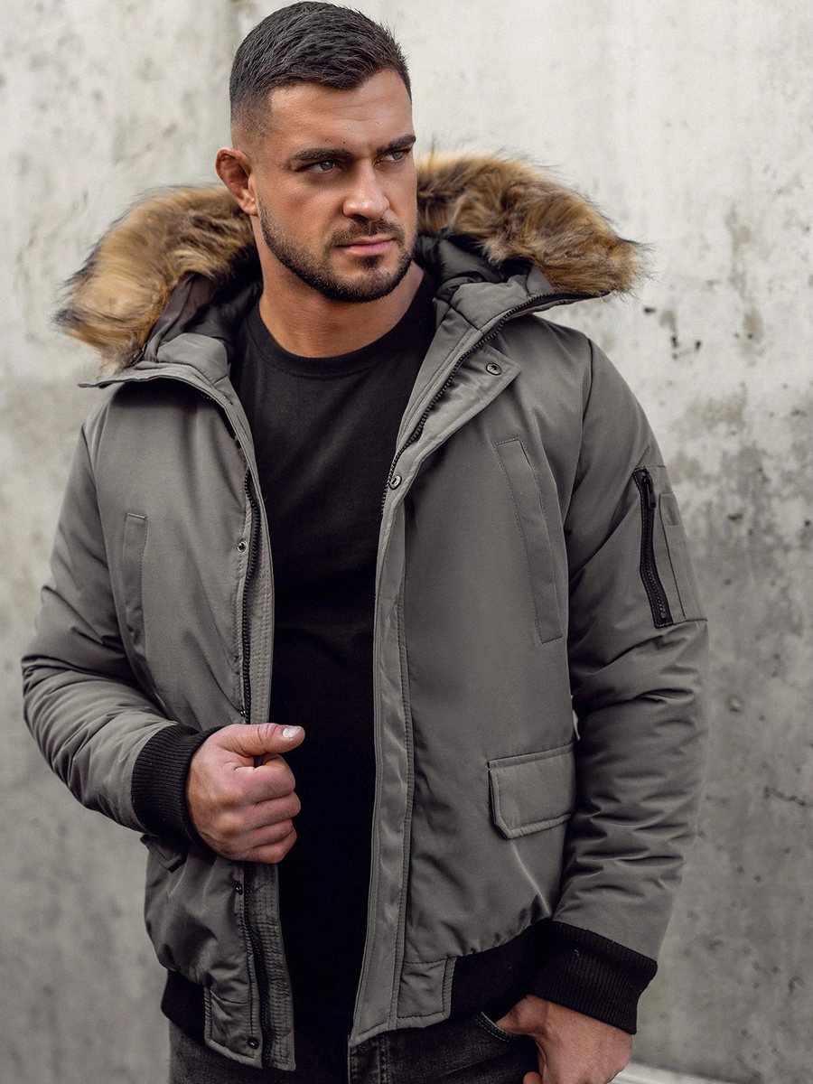 Grafitgrå vinterjacka med många fickor och dekorativ pälshuva från Bolf kollektionen. Bekväm, snäppfickor. Passar perfekt till vardagen. Bär den tillsammans med en sweatshirt och jeans eller joggers.