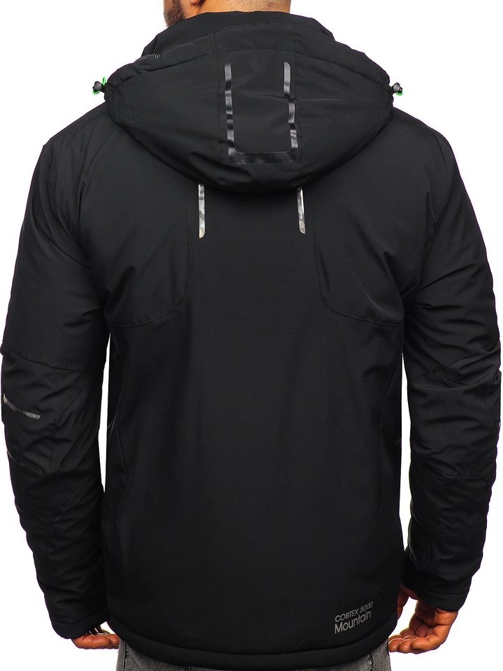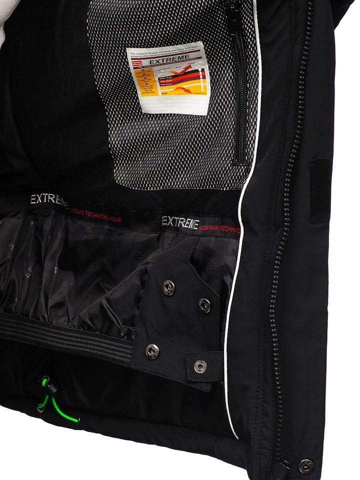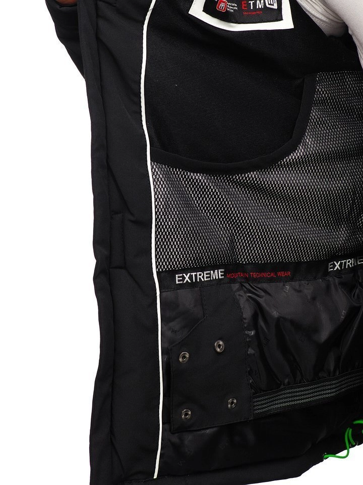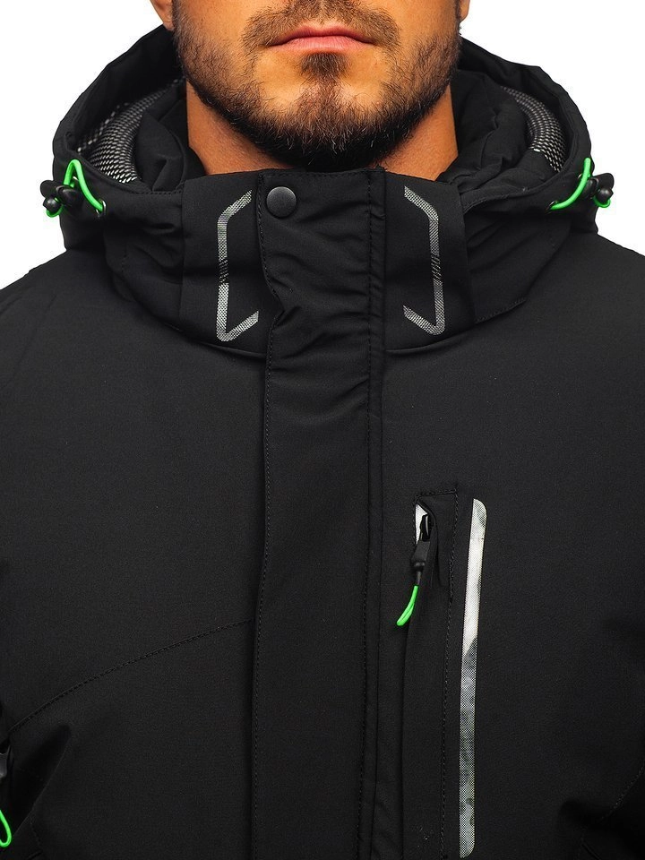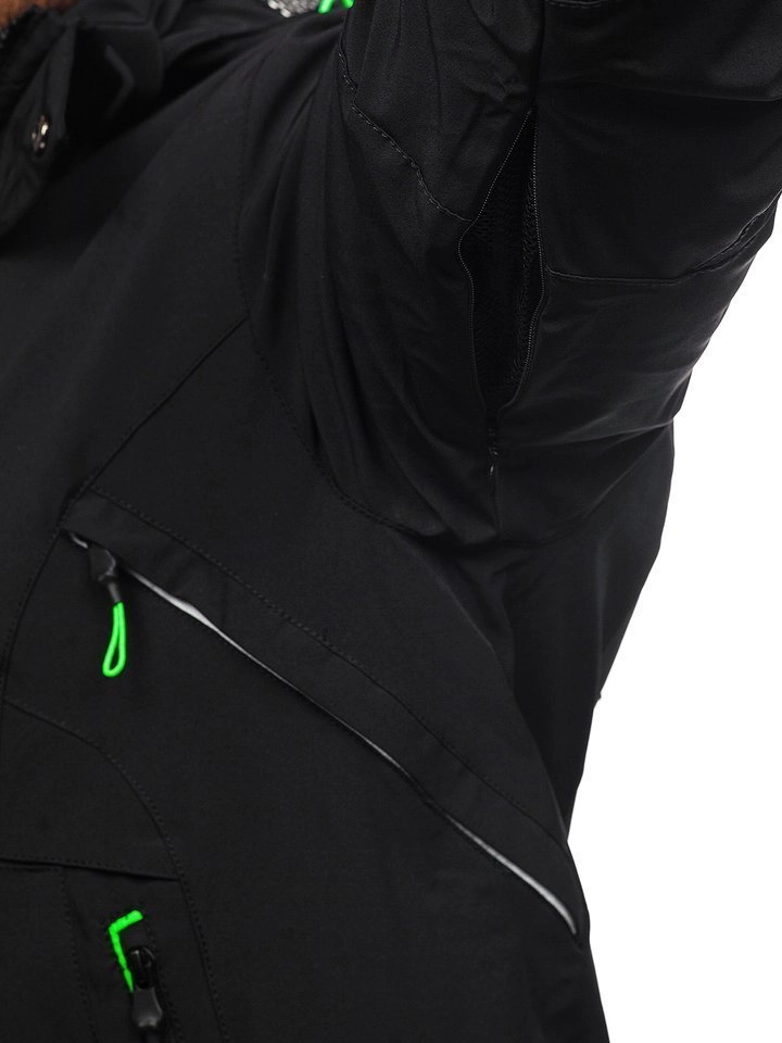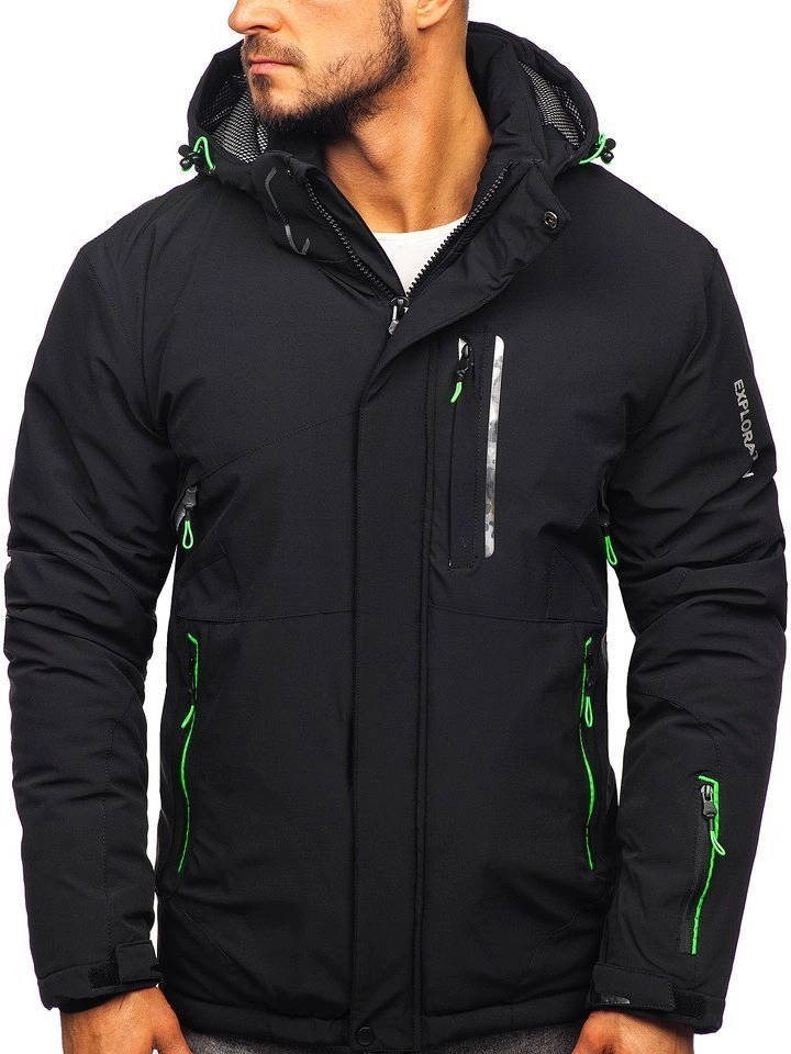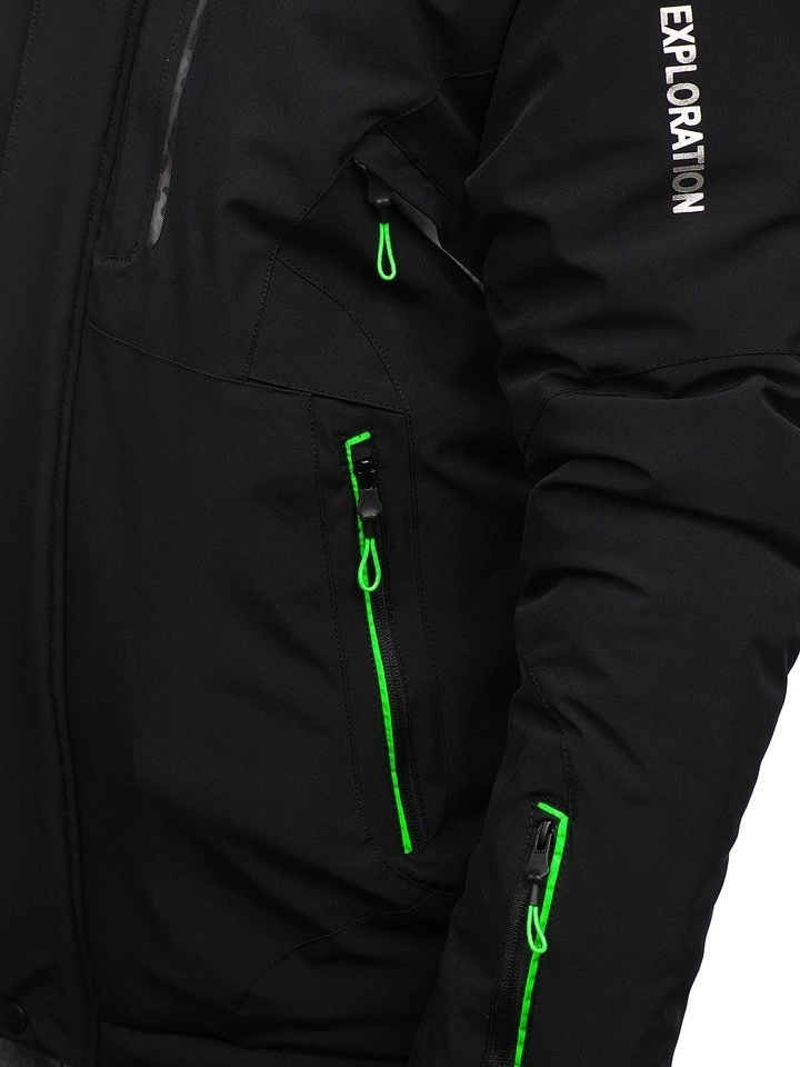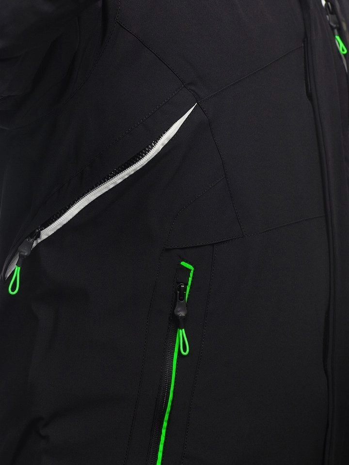 Svart och grön herr vinter skidjacka 1910. Det finns många praktiska lösningar som: en stå upp krage med dragkedja och knäppning, en justerbar och avtagbar luva, ventilation på sidorna, en invändig ficka för mobiltelefonen, ribbade ärmar,fickor med dragkedja och en bröstficka. Kännetecknet för denna jacka är kontrasterande inlägg och tryck på ärmen. Denna skidjacka passar perfekt för vinteraktiviteter. Bra skydd mot kyla och blåst. Klassisk design och en jacka som ni kommer kunna ha under flera år.