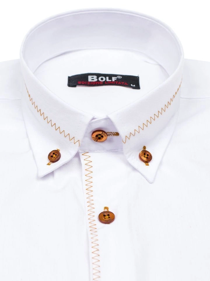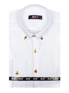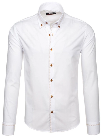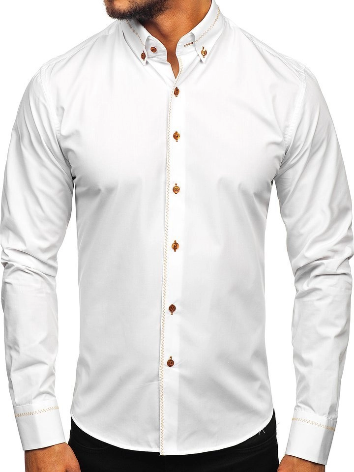 Vit herr långärmad skjorta 6964. Den har button-down krage, justerbara manschetter och kontrastknappar. Kännetecknande för denna skjorta snygga sömmar längs knapparna, på kragen och manschetterna. Den här eleganta skjortan är slim fit och understryker silhuetten. Den är en bra alternativ till en klassisk skjorta.