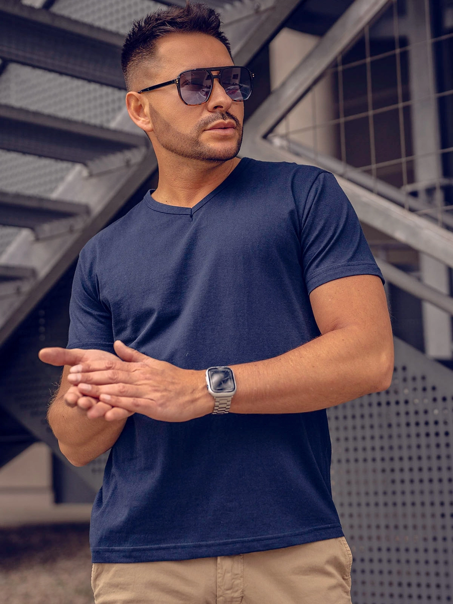 Solid V-neck T-shirt 192131 från Bolf kollektionen. Original marinblå T-shirt. Perfekt passform och understryker snyggt silhuetten. Det är tillverkat av ett mjukt material av hög kvalitet. Passar till flertalet stilar och andra klädesplagg.