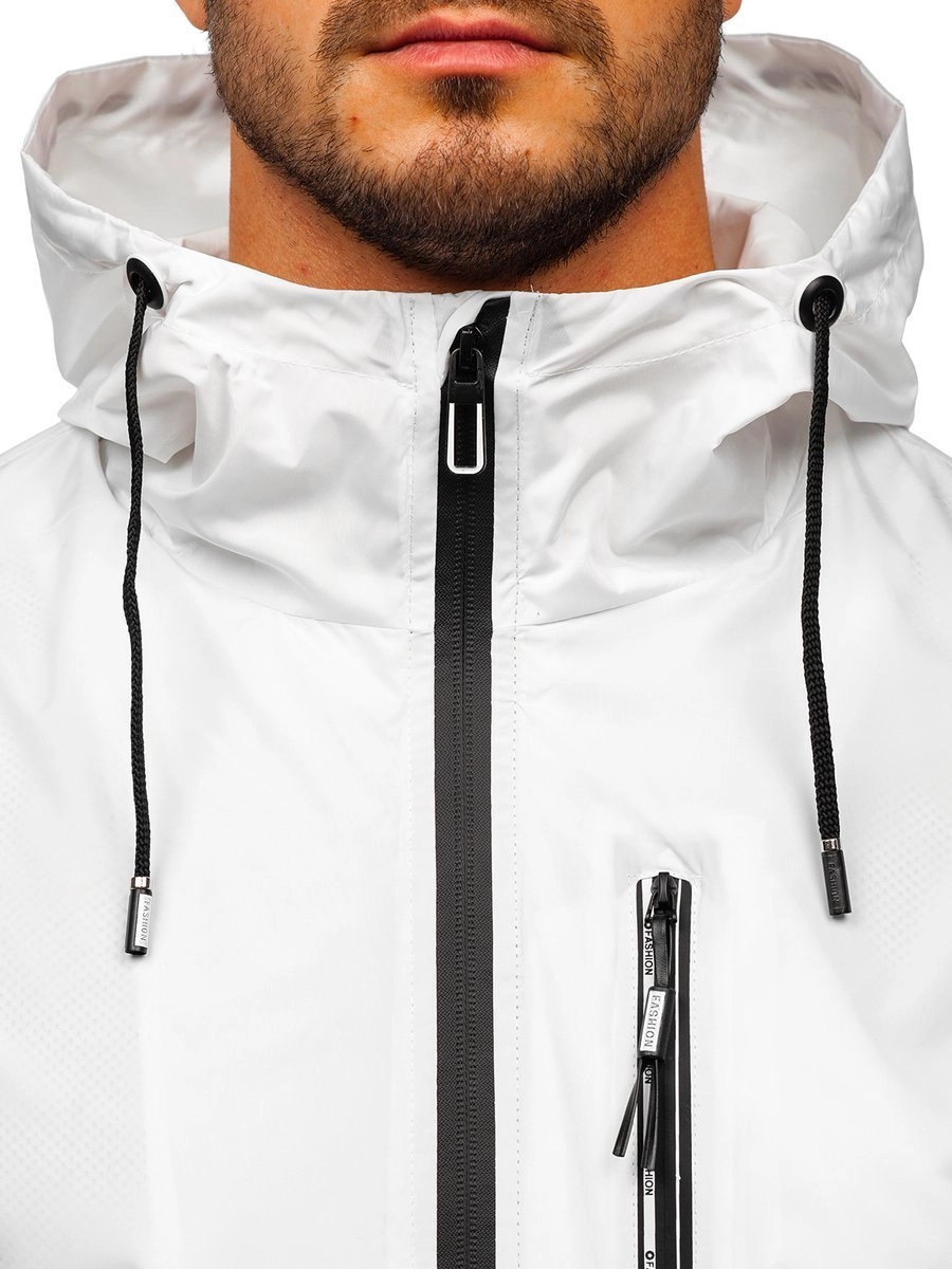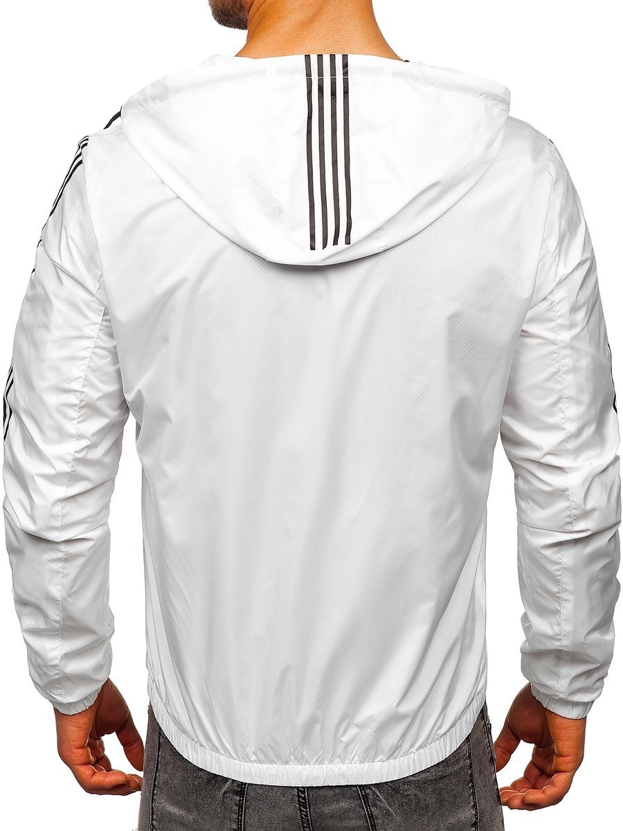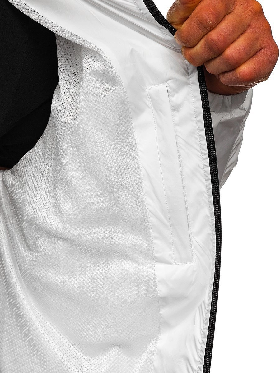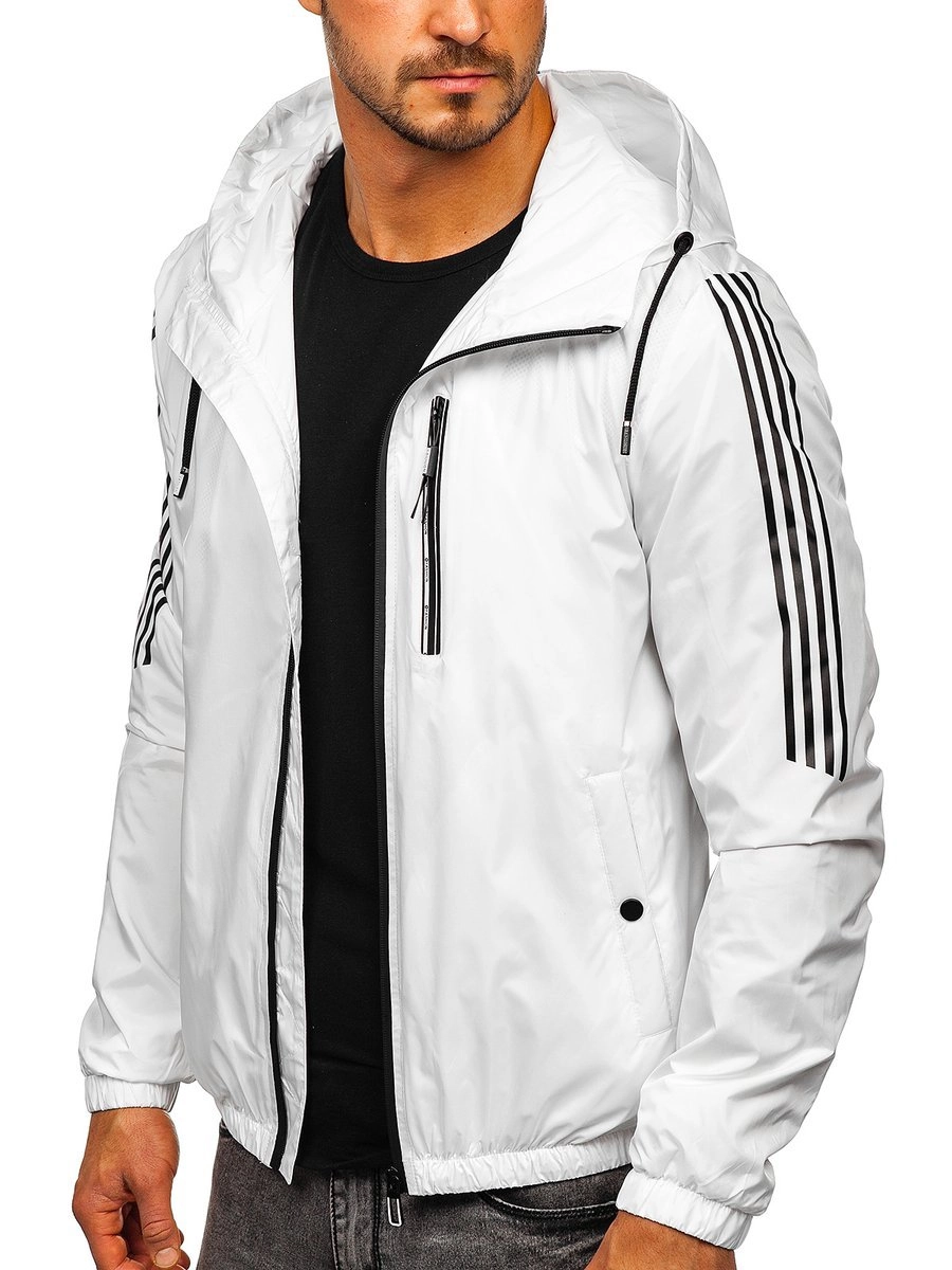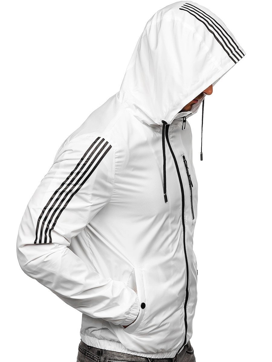 Vit herr lättvästjacka 6172 från Bolf-kollektionen. Ger bra skydd mot regn och vind.. Den har en stå-upp krage och en justerbar huva. Den har två snäppfickor och en praktisk ficka med dragkedja. Ärmarna är ribbade. Den är dekorerat med snygga mönster på ärmarna och på huvan. den passar bra under kalla dagar. Kombinera tillsammans med sweatshirt, jeans, cargobyxor eller sweatpants.