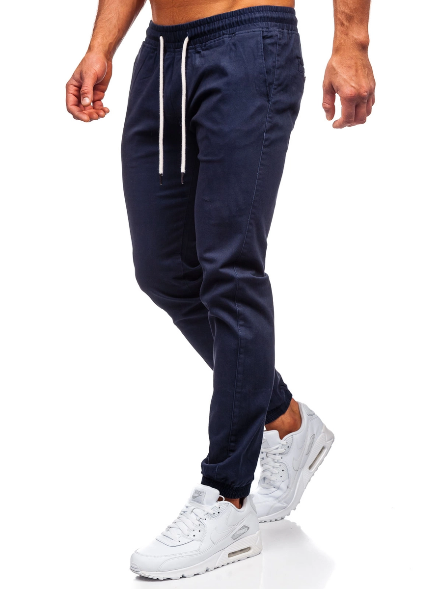 Klassiska mörkt marinblå herr joggers 1145 från Bolf kollektionen. De är tillverkade av bomull, har rymlig passform och är varma och bekväma. Denna modell finns i basic färger, vilket gör det till ett fint inslag i avslappnad styling. Det finns en dragkedja i midjan och har ribbade ben. Två knappfickor fram och bak. Dom passar perfekt vid massor av olika tillfällen. Mjuka lätta herrjoggers kan vi rekommendera för män som värderar bekvämlighet och snyggt utseende. En perfekt bas i en ungdomlig stil. Ett av Bolfs bästsäljande plagg. Den utmärkta kvaliten på sömnad och material gör att de kommer att hålla i många säsonger. Tack vare att byxorna är flexibla och anpassar sig efter figuren så är de ett utmärkt val för aktiva män, inte bara till träning utan de passar även på resor eller andra sociala sammanhang. Byxorna passar på kontoret en avslappnad fredag, eller alla andra arbeten som tillåter valfri klädsel. Du kan ha dem till skolan, på promenaden eller in till stan med kompisarna. De är även ett utmärkt alternativ till bekväma sweatpants när du exempelvis är på resande fot. Snygga joggers kan vara basen både till vardags och till en streetwearstil. Kombinera gärna med en sweatshirt, T-shirt eller en långärmad topp. De passar bra ihop med en lättviktsjacka, en sportjacka, en skinnjacka eller en bomberjacka.