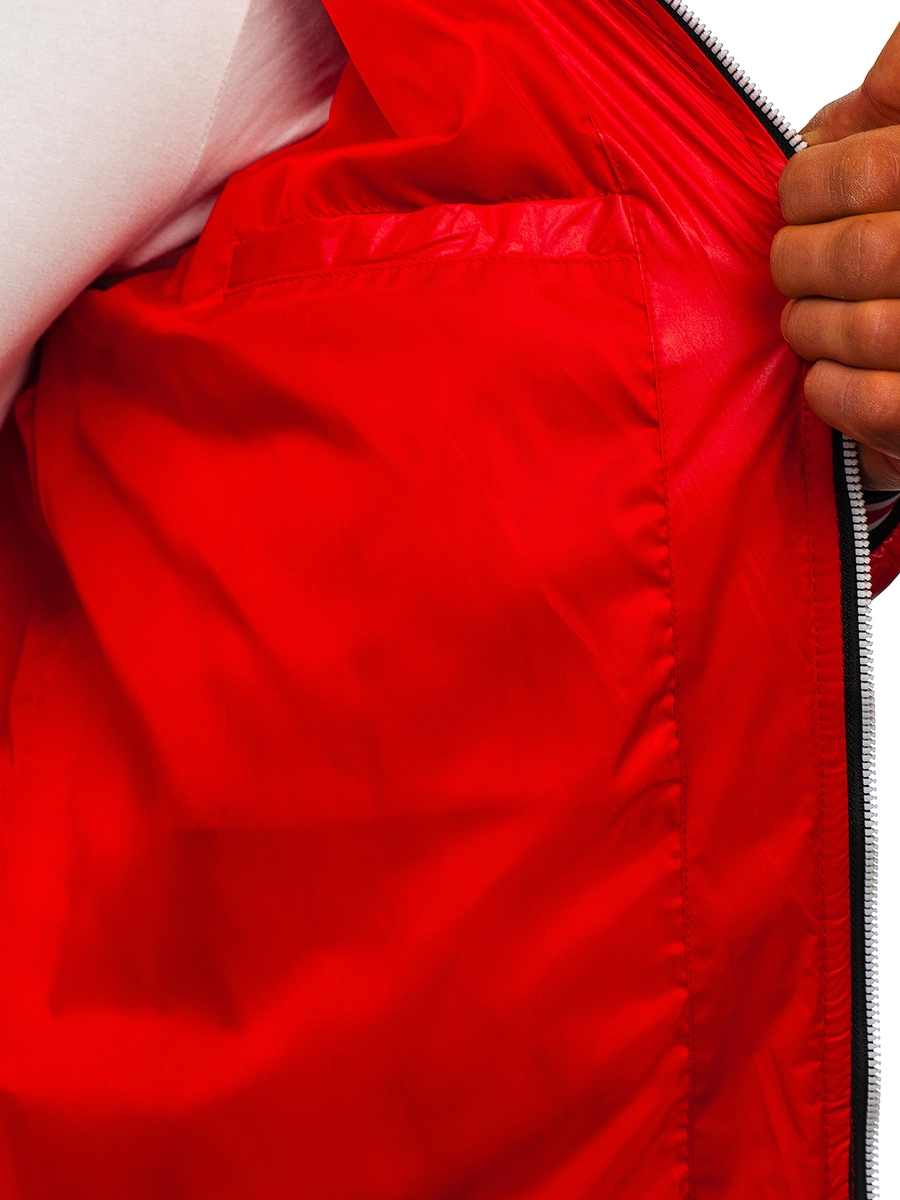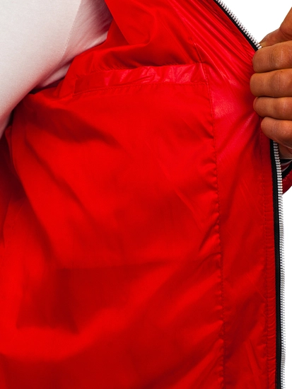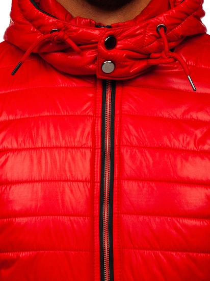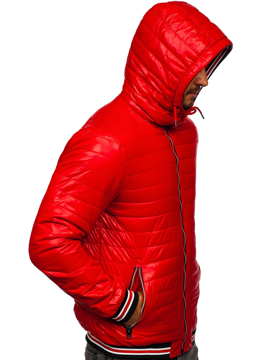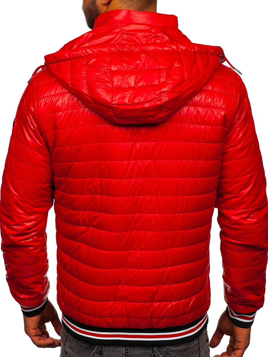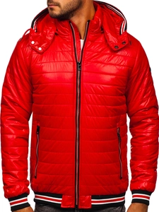 Iögonfallande röd quiltad herr lättviktsjacka 6191 från Bolfs kollektion. Hela jackan är vadderad. Det finns en dragkedja och en stå-upp krage. Den är utrustad med ribbade ärmar, huva och nertill. Två utvändiga fickor med dragkedja. Justerbar och avtagbar huva. Passar perfekt till sportig stil - varje dag. På promendader, utekväll med vänner eller på shoppingrundan. Använd med ett par joggers och en T-shirt eller med jeans och en tröja, likaväl som med en sweatshirt.