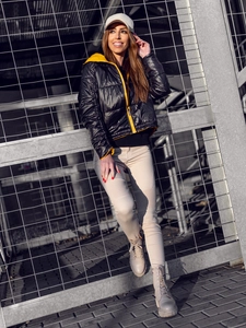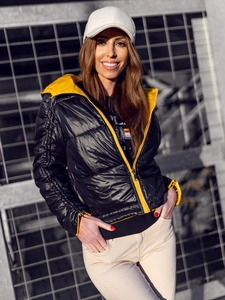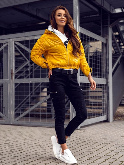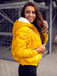 Gul quiltad vändbar dam lättviktsjacka med huva B9553 från Bolfs kollektion. Det glansiga materialet gör den väldigt iögonfallande. Hela jackan är vadderad. Den är vändbar - svart på insidan så att du kan variera ditt utseende varje gång. Den är utrustad med blixtlås. Den har en huva fäst på kragen och två utvändiga fickor. Använd tillsammans med ett par jeans eller leggings. Passar bra med en sweatshirt. Du kan även använda den tillsammans med ett par sweatpants.