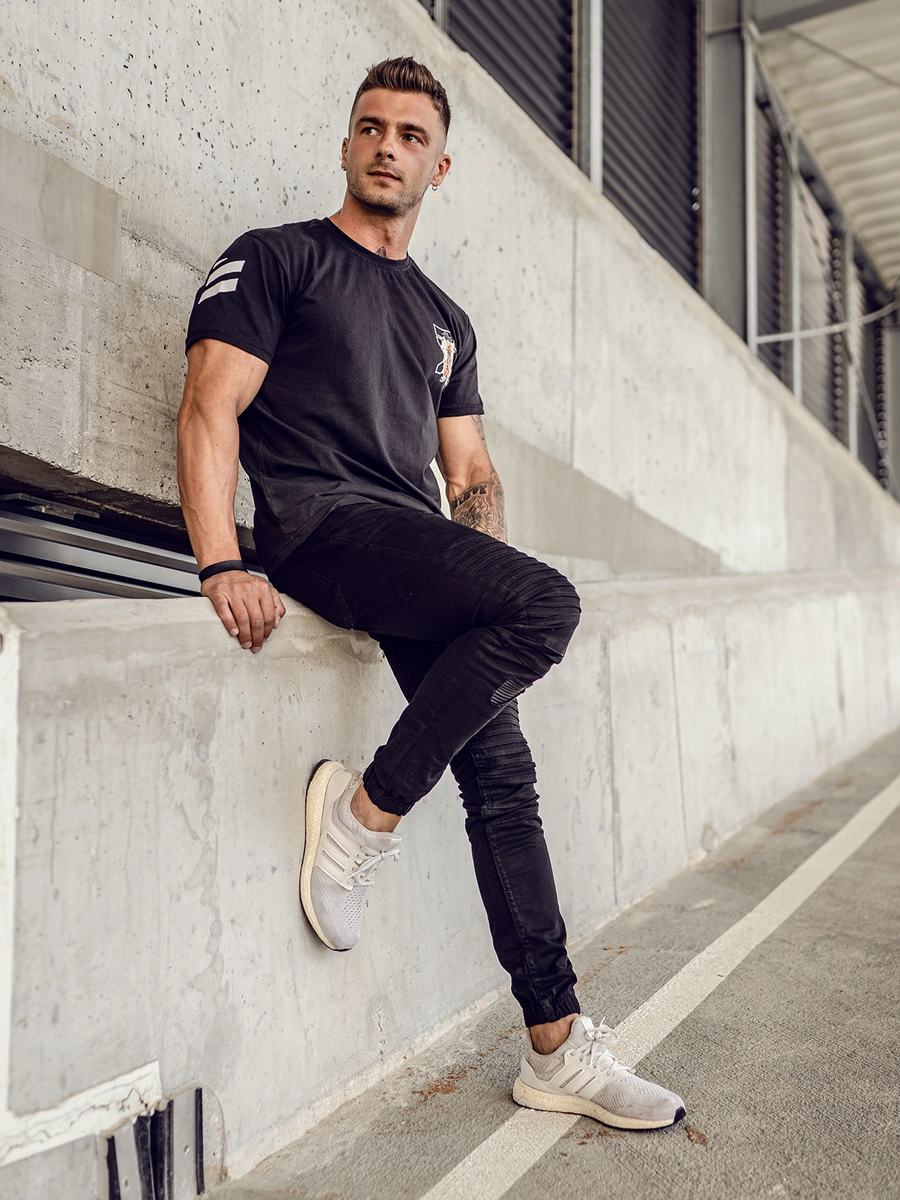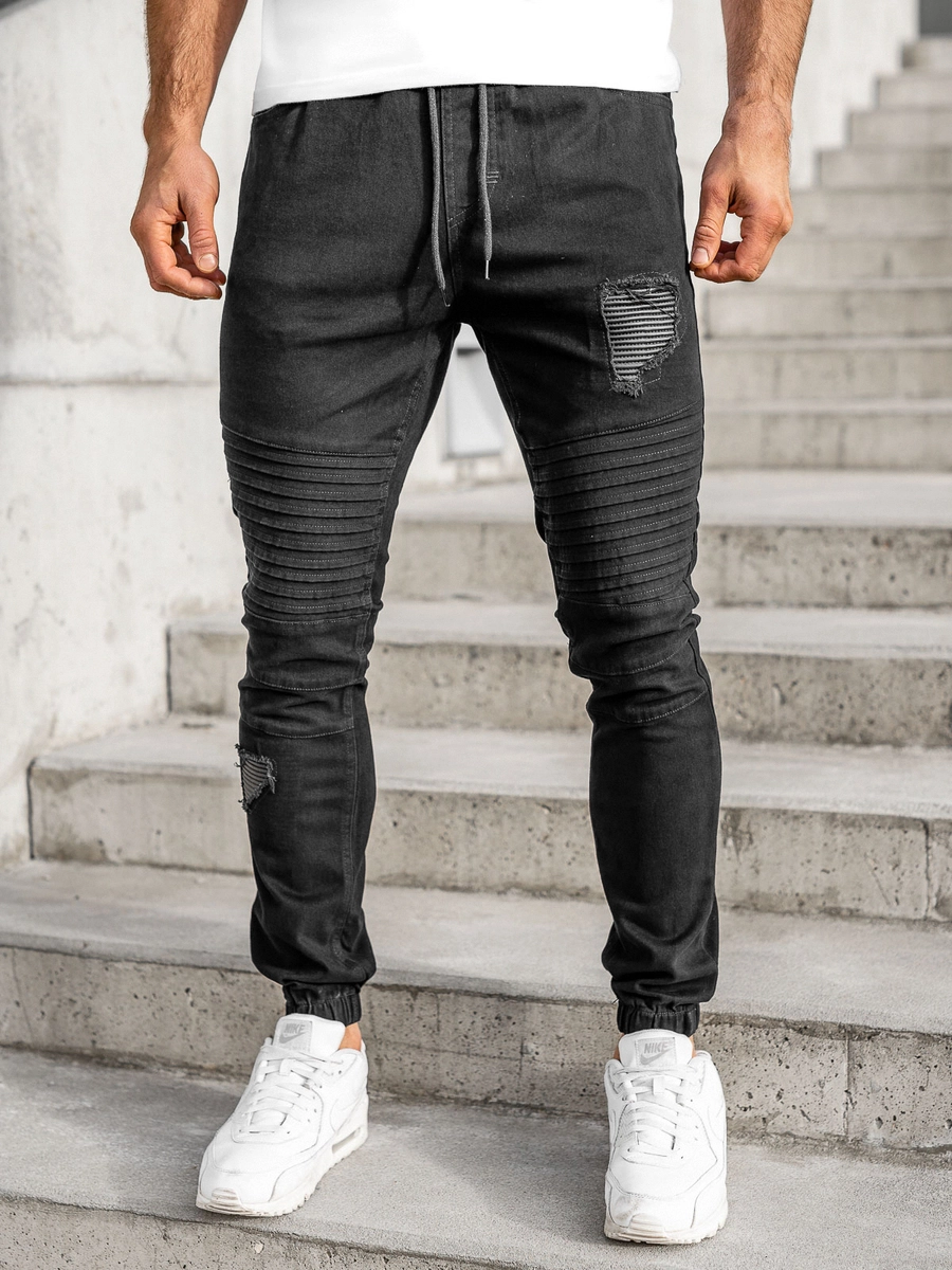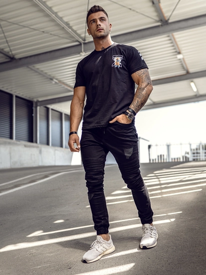 Utsökta svarta herrjoggers från Bolfs kollektion tillverkade i bomull av hög kvalitet. Bra passform och passar till streetwearstil. De har iögonfallande sömmar och fejkläderinsatser. Den presenterade modellen ser bra ut med en T-shirt, en kort jacka eller en sweatshirt.