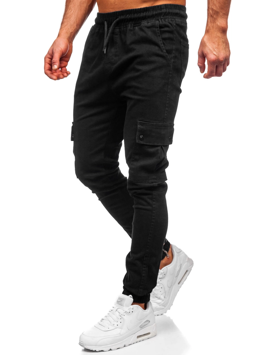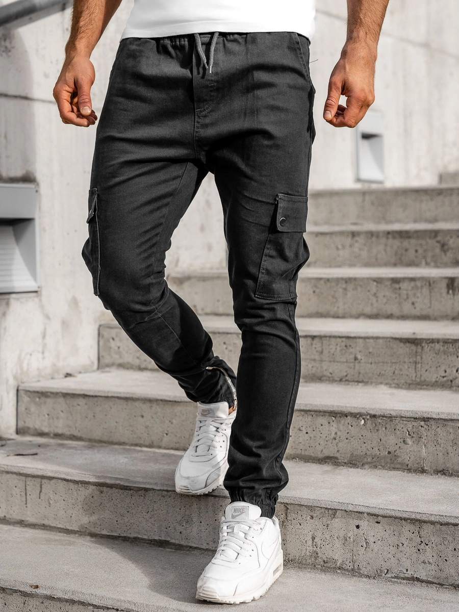 Fantastiska svarta herr cargojoggers i bomull 0858 från Bolf-kollektionen! Modellen är väldigt bekväm och varm. Denna modell finns i basic färger, vilket gör det till ett fint inslag i avslappnad styling. Dessa joggers har en fejkgylf och midjereglering med dragsko. De har även ribbade ben dekorerade med drakedjor. Två fickor fram och bakfickor. Byxor som passar perfekt till olika tillfällen. En tight och bekväm passform. Ett av Bolfs bästsäljande plagg. Den utmärkta kvaliten på sömnad och material gör att de kommer att hålla i många säsonger. Snygga joggers kan användas både till vardags och till en streetwearstil. Ett ypperligt tillfälle att skapa en snygg stil. Den här modellen är designad för dig som uppskattar bekvämlighet och stil. En perfekt bas i en ungdomlig stil. Tack vare att byxorna är flexibla och anpassar sig efter figuren så är de ett utmärkt val för aktiva män, inte bara till träning utan de passar även på resor eller andra sociala sammanhang. Kombinera gärna med en sweatshirt, T-shirt eller en långärmad topp. De passar bra ihop med en lättviktsjacka, en sportjacka, en skinnjacka eller en bomberjacka. Byxorna passar på kontoret en avslappnad fredag, eller alla andra arbeten som tillåter valfri klädsel. Du kan ha dem till skolan, på promenaden eller in till stan med kompisarna. De är även ett utmärkt alternativ till bekväma sweatpants när du exempelvis är på resande fot.