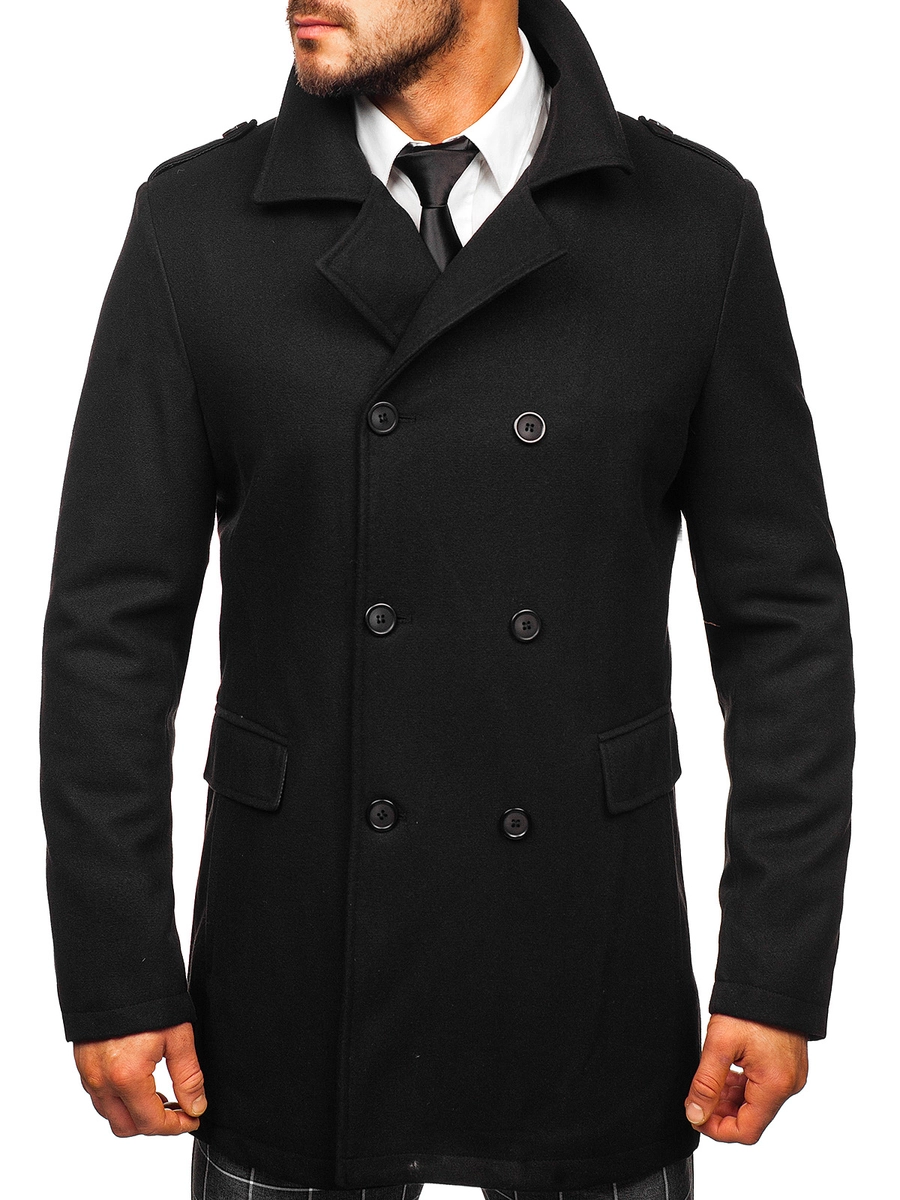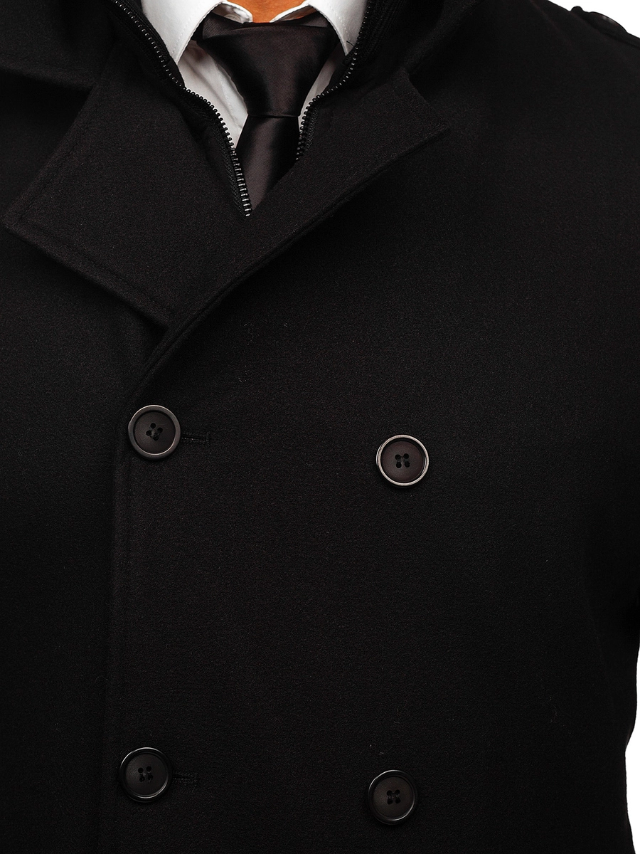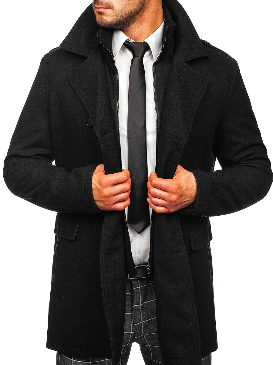 Svart dubbelbröstad herr vinterrock med avtagbar ståkrage 8805 från Bolfs kollektion. Det är ett plagg för män som gillar att leka med modet och som gillar klassiska modeplagg. Det är en klassisk dubbelknäppt rock med både dragkedja och praktiska knappar. Den har en stor snygg krage med slag i samma färg och en ytterligare ståkrage innanför. Den är utrustad med blixtlås. Ser snygg ut både knäppt och öppen. Två utvändiga fickor med snygga lock och en innerficka med dragkedja. Den har eleganta dekorativa epauletter på axlarna, vilka adderar stil och karaktär. Ärmarna är raka. Ryggen har ett imitationsbälte vilket ger den ett unikt snitt. Rocken är tillverkad i material av hög kvalitet. Den är väldigt originell men har samtidigt en tidlös elegans. Passar den manliga kroppsformen perfekt. En väldigt snygg och chic produkt, rekommenderas till män som har höga krav på modet. Använd med ett par jeans, en tröja eller en polotröja eller varför inte med chinos, en skjorta eller en kavaj. Denna typ av rock passar bra både till bröllop, familjesammankomster eller viktiga affärsmöten. En användbar rock med en avtagbar ståkrage är perfekt under arbetsdagen likaväl som under mer formella sammanhang. Kan användas till alla klassiska kläder. Bolfs onlinebutik erbjuder den till ett väldigt bra pris. Ett av Bolfs bästsäljande plagg. Dess diskreta och behagliga färger gör den lätt att kombinera med andra plagg.
