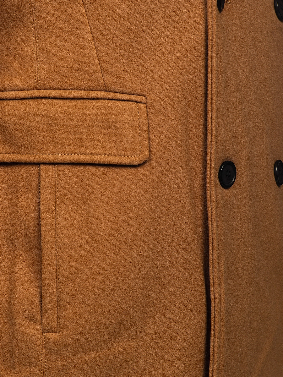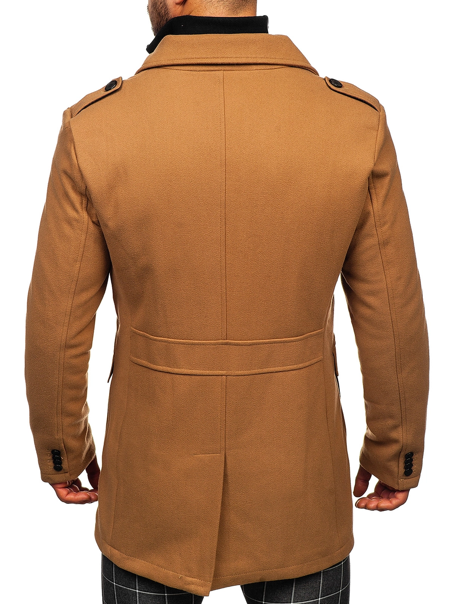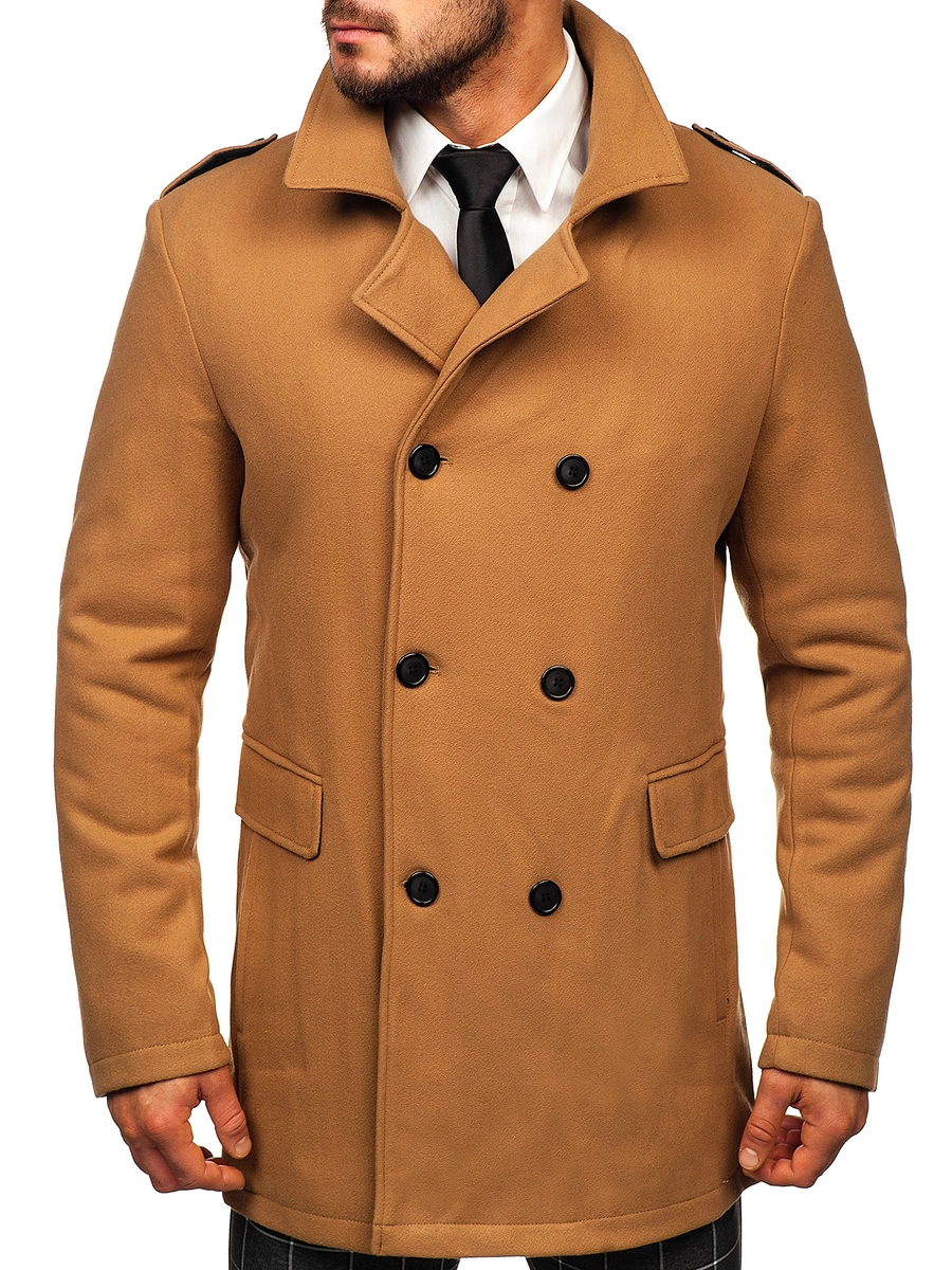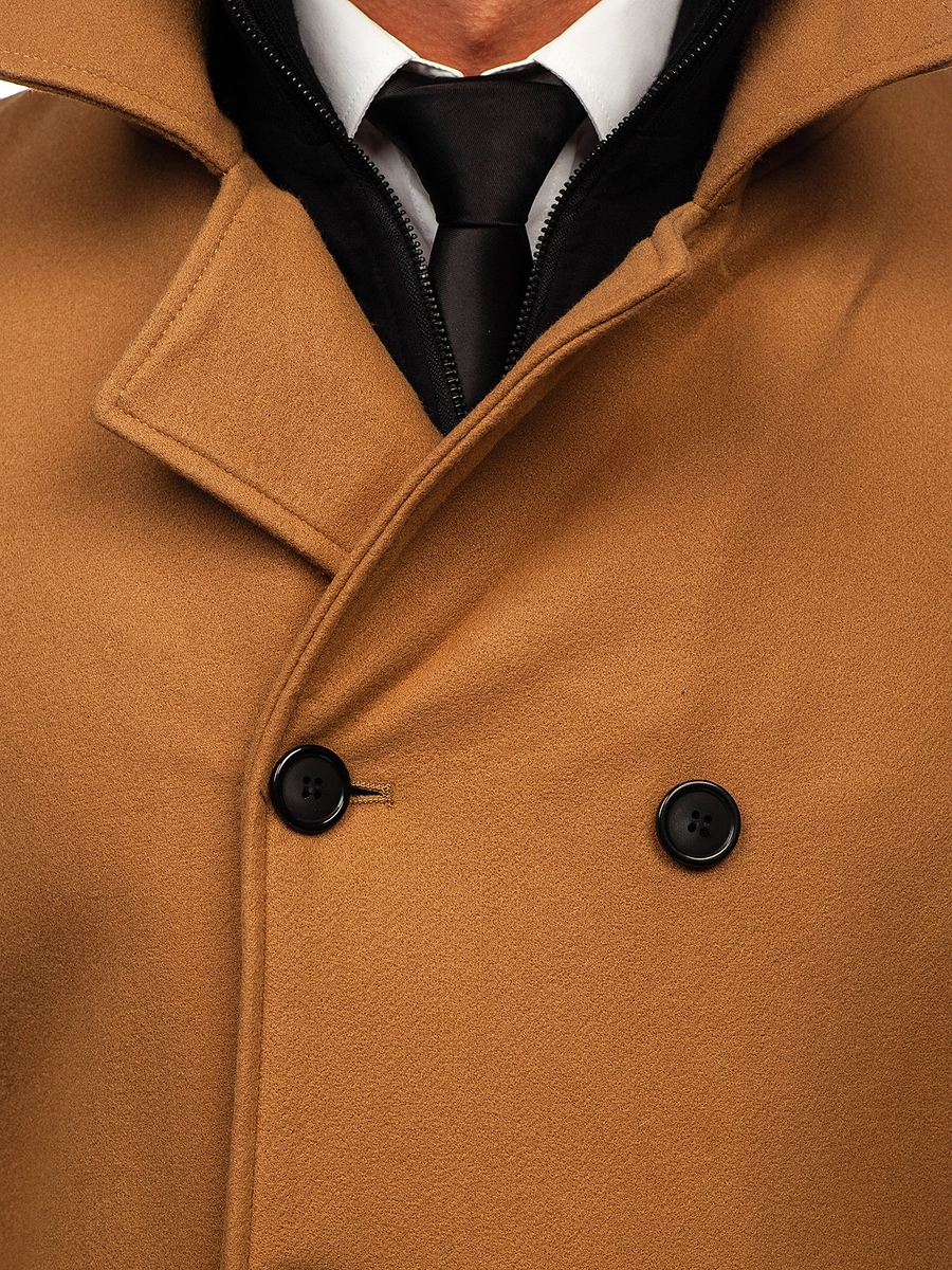 Kamelfärgad dubbelbröstad herr vinterrock med avtagbar ståkrage 8805 från Bolfs kollektion. Det är ett plagg för män som gillar att leka med modet och som gillar klassiska modeplagg. Det är en klassisk dubbelknäppt rock med både dragkedja och praktiska knappar. Den har en stor snygg krage med slag i samma färg och en ytterligare ståkrage innanför. Den är utrustad med blixtlås. Ser snygg ut både knäppt och öppen. Två utvändiga fickor med snygga lock och en innerficka med dragkedja. Den har eleganta dekorativa epauletter på axlarna, vilka adderar stil och karaktär. Ärmarna är raka. Ryggen har ett imitationsbälte vilket ger den ett unikt snitt. Rocken är tillverkad i material av hög kvalitet. Den är väldigt originell men har samtidigt en tidlös elegans. Passar den manliga kroppsformen perfekt. En väldigt snygg och chic produkt, rekommenderas till män som har höga krav på modet. Använd med ett par jeans, en tröja eller en polotröja eller varför inte med chinos, en skjorta eller en kavaj. Denna typ av rock passar bra både till bröllop, familjesammankomster eller viktiga affärsmöten. En användbar rock med en avtagbar ståkrage är perfekt under arbetsdagen likaväl som under mer formella sammanhang. Kan användas till alla klassiska kläder. Bolfs onlinebutik erbjuder den till ett väldigt bra pris. Ett av Bolfs bästsäljande plagg. Dess diskreta och behagliga färger gör den lätt att kombinera med andra plagg.