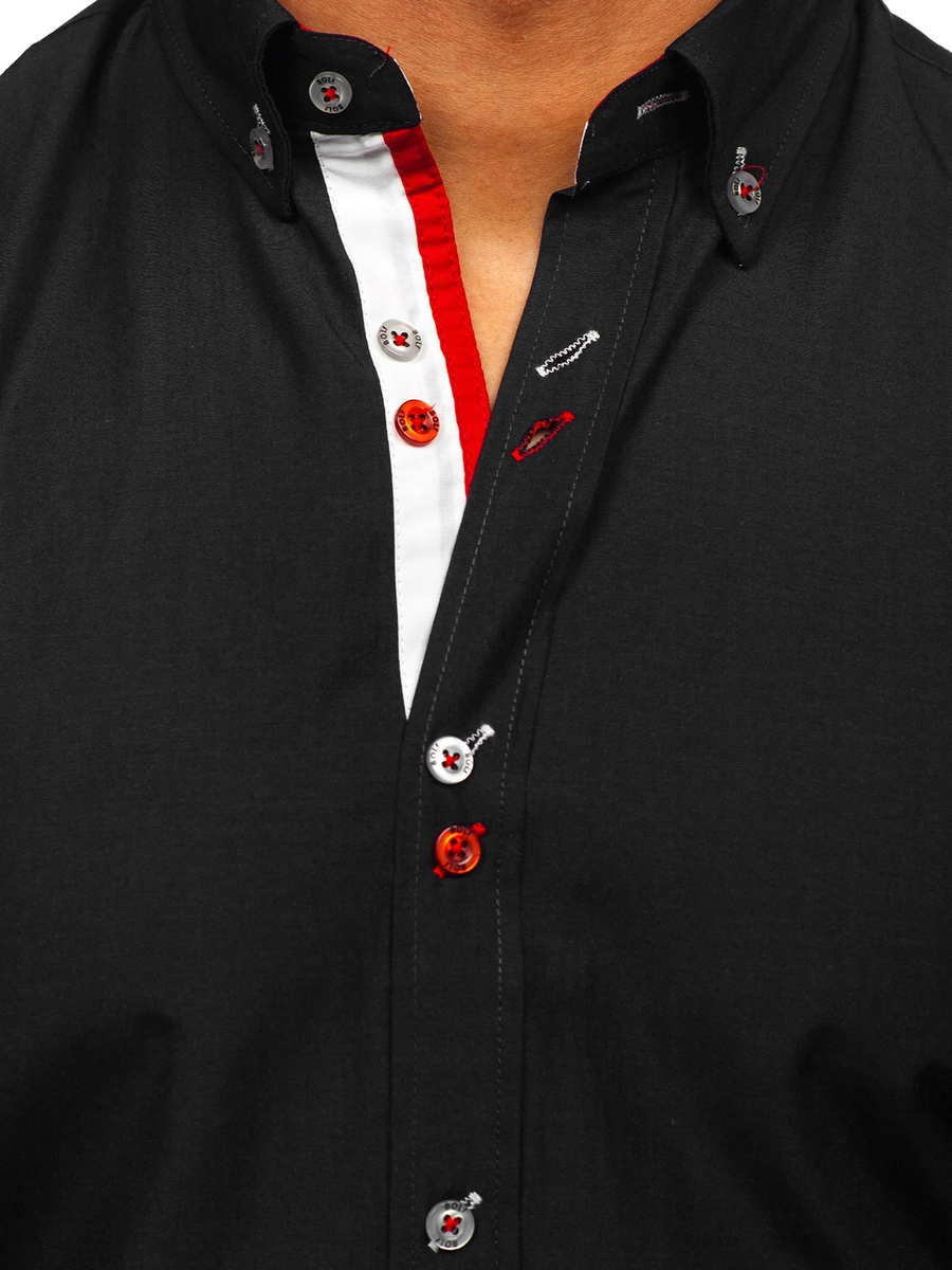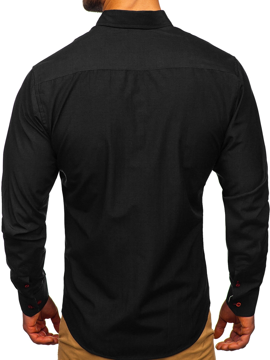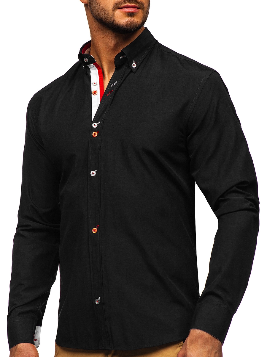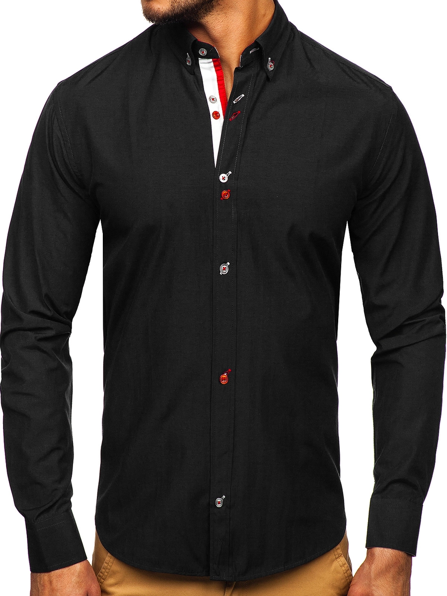 Svart långärmad skjorta 20710 från Bolf-kollektionen En skjorta är ett måste i varje herrgarderob. Produkten har långa ärmar och knäpps med knappar. Skjortan har en button down-krage som ger stil. Skjortans fåll är rak och ärmsluten är justerbara, raka, enkel- och enkelknäppning. Den slimmade produkten kommer att framhäva din figur perfekt. Den är avsedd för fans av en avslappnad stil. Skjortan kan bäras för alla tillfällen. Den är gjord av 80% bomull och 20% polyester. Den passar bra med jeans eller bomullsbyxor.