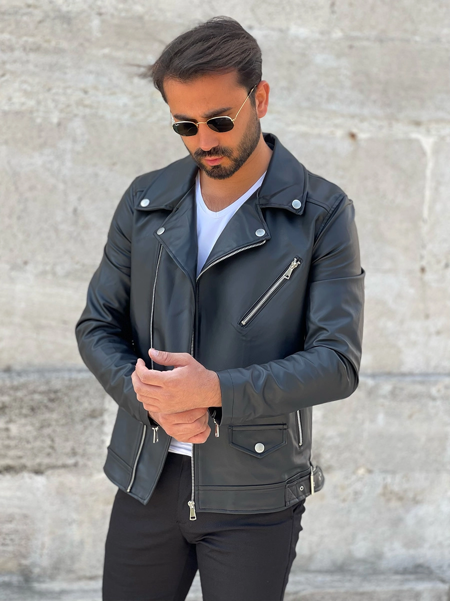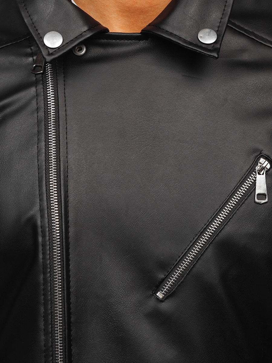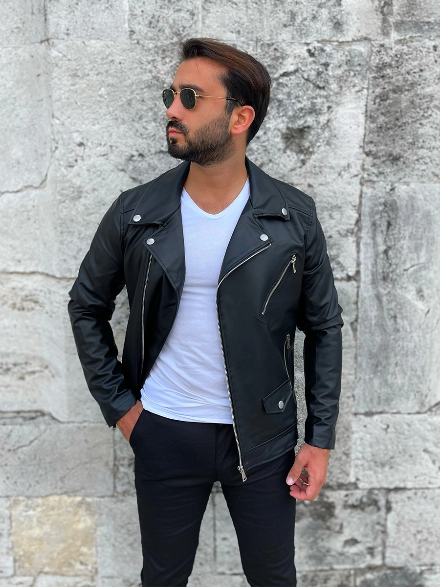 Snygg herrskinnjacka i bikermodell 0006 från Bolfs kollektion. Den svarta bikerjackan har varit väldigt populär inom herrmodet i årtionden. Den är utrustad med blixtlås. Den har två ytterfickor med dragkedja och en imitationsficka med dragkedja på bröstet. Nertill finns en imitationsficka med lock. Den är justerbar nertill med ett snyggt spänne och ärmarna är justerbara med dragkedja. Den här modellen är tänkt till de som gillar en vardaglig stil. Perfekt för en promenad, en date eller för en shoppingtur. Den är tillverkad av ekoskinn. Den består av 50% PFC, 40% polyester och 10% polyuretan. Den passar perfekt med en långärmad top eller jeans.