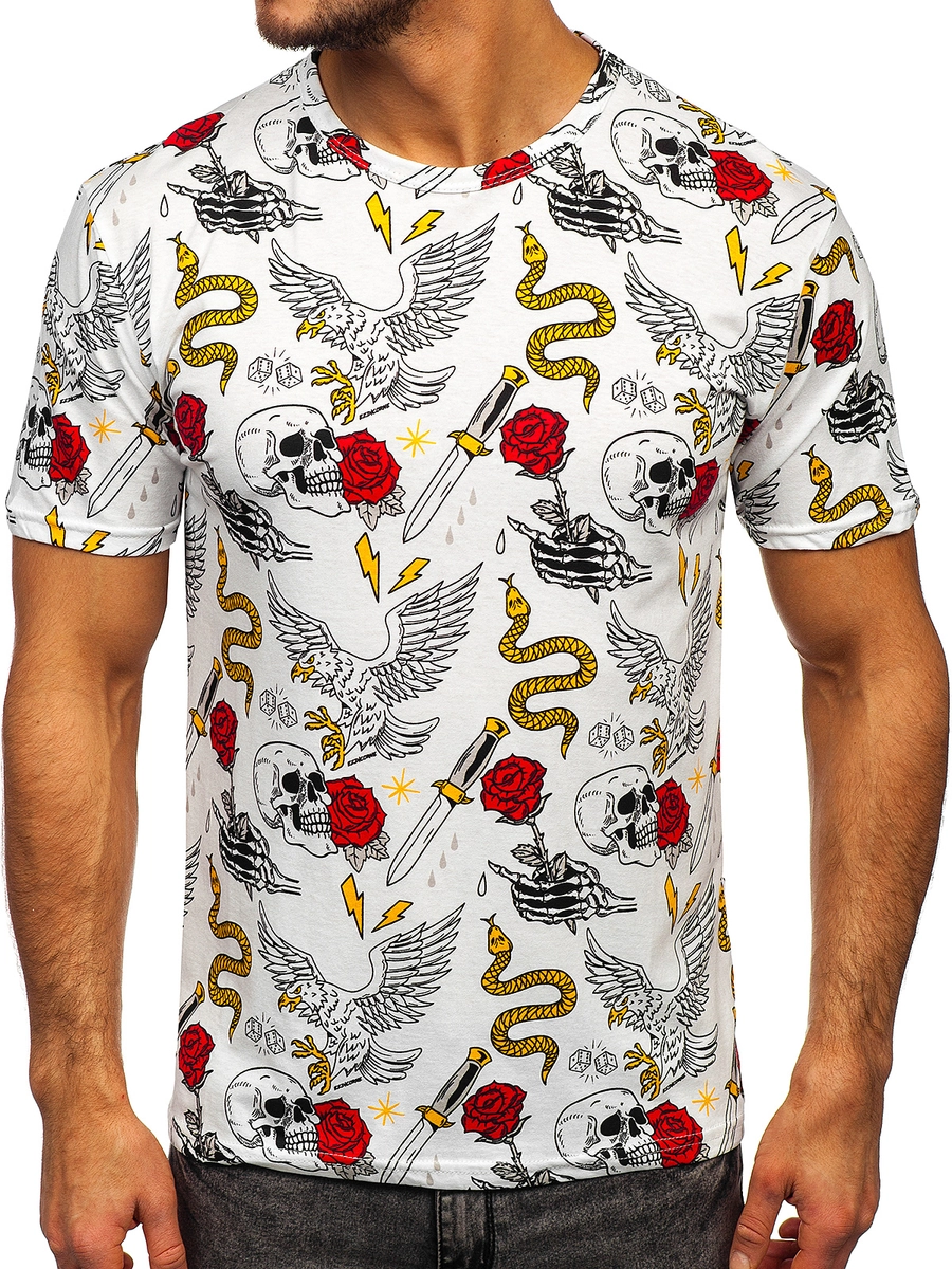 Fantastisk vit herr T-shirt med tryck 14900 från Bolfs kollektion. En T-shirt i bomull med ett intressant tryck bör finnas i varje herrgarderob. Den har en rund halsringning. Perfekt för promenader, resor till staden eller möten med vänner. T-shirten är gjord av 100% bomull. Fäster perfekt till figuren, den är stretchig och bekväm. Skapa en perfekt matchning med jeans, chinos eller joggers.