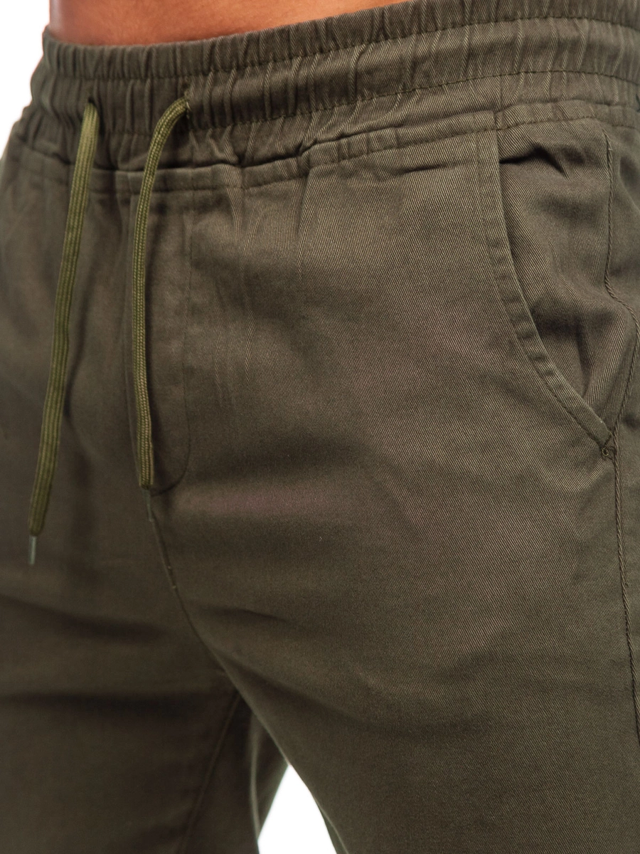 Klassiska kaki herr joggers 707 från Bolf kollektionen. Joggare har varit mycket populära inom herrmodet de senaste åren, nu är de ett måste i garderoben för alla streetstylingälskare. Tack vare midjejusteringen med kraftig passform och dragsko kommer produkten att passa alla mansfigurer. Ett praktiskt inslag är två fickor på framsidan och två fickor på baksidan med knapp. Benen är avslutade med en praktisk passform. Byxorna är gjorda av 100% bomull. Skapa en perfekt matchning med en tröja, en långärmad topp eller en T-shirt.