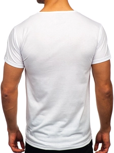 Fantastisk vit herr T-shirt med tryck KS2633 från Bolfs kollektion. T-shirten är universell, du kan bära den för ett möte med vänner, en promenad eller en tur till staden. Den har en praktisk, rund halsringning. Ett intressant tryck på framsidan kommer att fånga ögat och få dig att sticka ut från mängden. Produkten är tillverkad av 65% bomull och 35% polyester, vilket gör den smidig och behaglig att ta på. Skapa en perfekt matchning med jeans, joggingbyxor eller chinos.