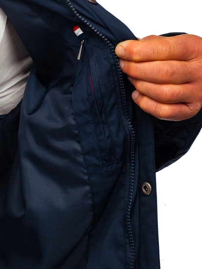 Elegent marinblå herr lättviktsjacka 2068 från Bolf-kollektionen. En jacka i en klassisk färg kommer att matcha vilken outfit som helst. Använd den på promenaden eller när du ska in till stan med kompisarna. En praktisk del av produkten är antalet fickor där du kan lagra de nödvändiga små föremålen. Den rundade botten förlänger silhuetten optiskt. Ärmarna är justerbara med bekväma tryckknappar. Jackan är gjord av 100% polyester. Skapa en perfekt matchning med jeans och en tröja.
