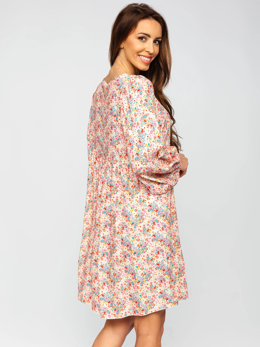 Vacker damklänning 3019 från Bolf-kollektionen. Tillverkad av behagligt material som andas. Lös skärning gör den mycket bekväm att bära och begränsar inte rörelsen. Fashionabla, blommönster ger femininitet och lätthet. Klänningen kommer att passa bra till våren och sommaren. Det kommer att vara det perfekta valet för ett möte med vänner, en promenad eller en dejt. Bär den med en denimjacka och sneakers. Tillgänglig i flera olika färger.