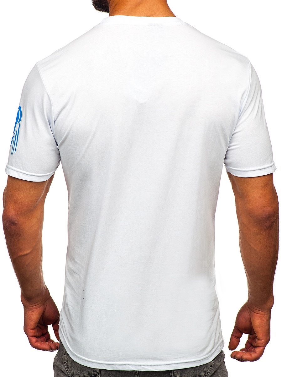 Cool vit T-shirt med tryck för män 192379 från Bolf-kollektionen. Tillverkad av högkvalitativ bomull, den är mjuk och behaglig att ta på. Den runda halsen och den passande skärningen gör att den framhäver figuren perfekt, samtidigt som den inte begränsar rörelsen. Trycket på framsidan ger karaktär och individualitet. Oavsett om du ska till stan med vänner, till jobbet eller shoppa så kommer denna t-shirtmodell att fungera perfekt. Det är lätt att kombinera det med andra klädesplagg. Det går bra med jeans, joggingbyxor och shorts.