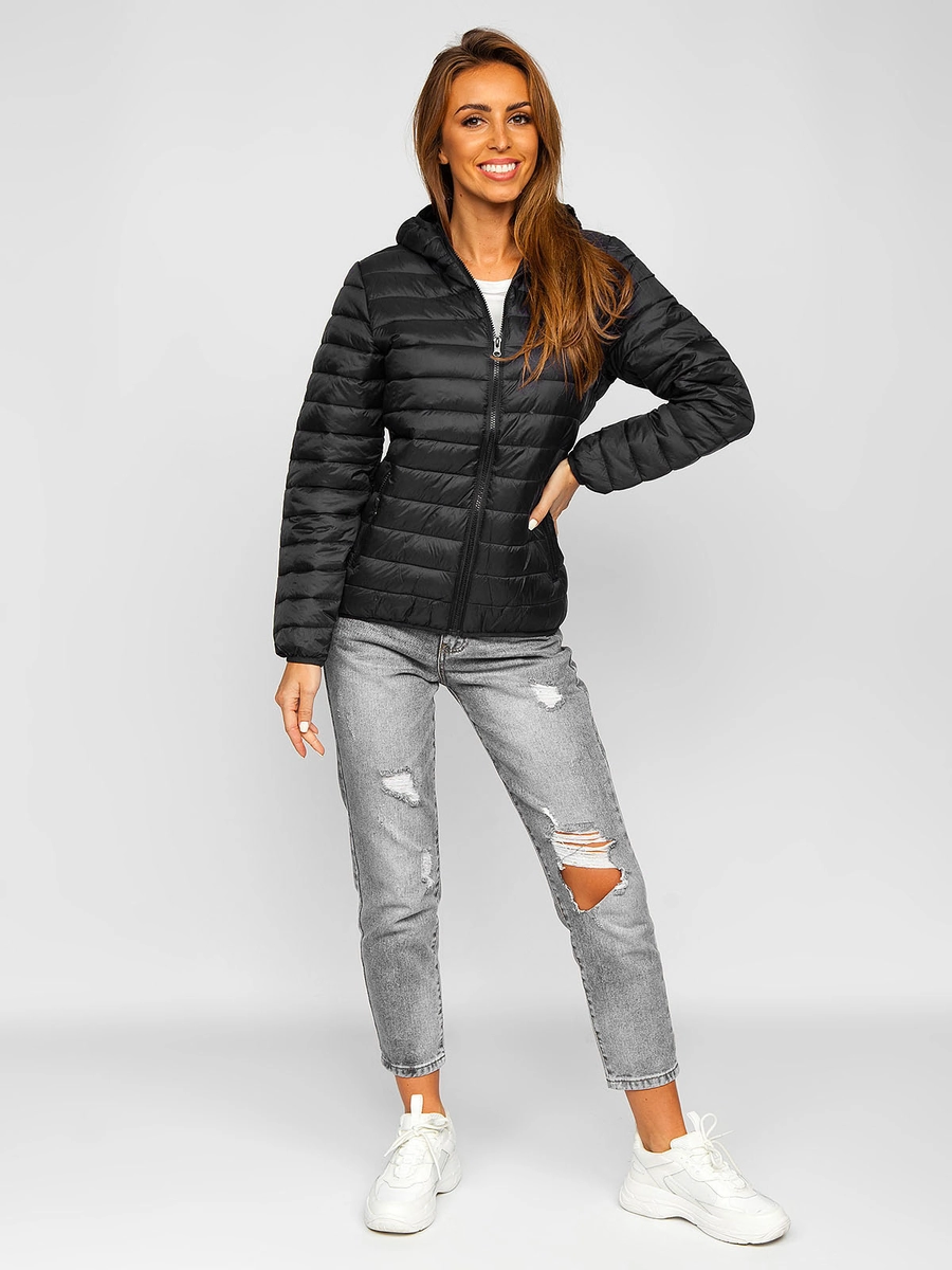 Snygg svart quiltad lättviktsjacka med huva M23036 från Bolfs kollektion. Övergångsjackan med huva kommer att gillas av alla aktiva kvinnor. Den tidlösa designen gör att du kommer vilja använda den i många år framöver. Den är utrustad med blixtlås. Den är tillverkad av 100% nylon, vilket gör den väldigt bekväm och flexibel. Jackan har två praktiska ytterfickor med dragkedja. Den har en elastisk mudd på ärmarna och nertill vilket gör att den anpassar sig efter kroppsformen. Tack vare dess mångsidighet kan den lätt matchas med många olika stilar. Perfekt för en promenad, en träff med kompisarna eller för en shoppingtur. I kombination med jeans och en T-shirt skapar den en snygg ledig stil.