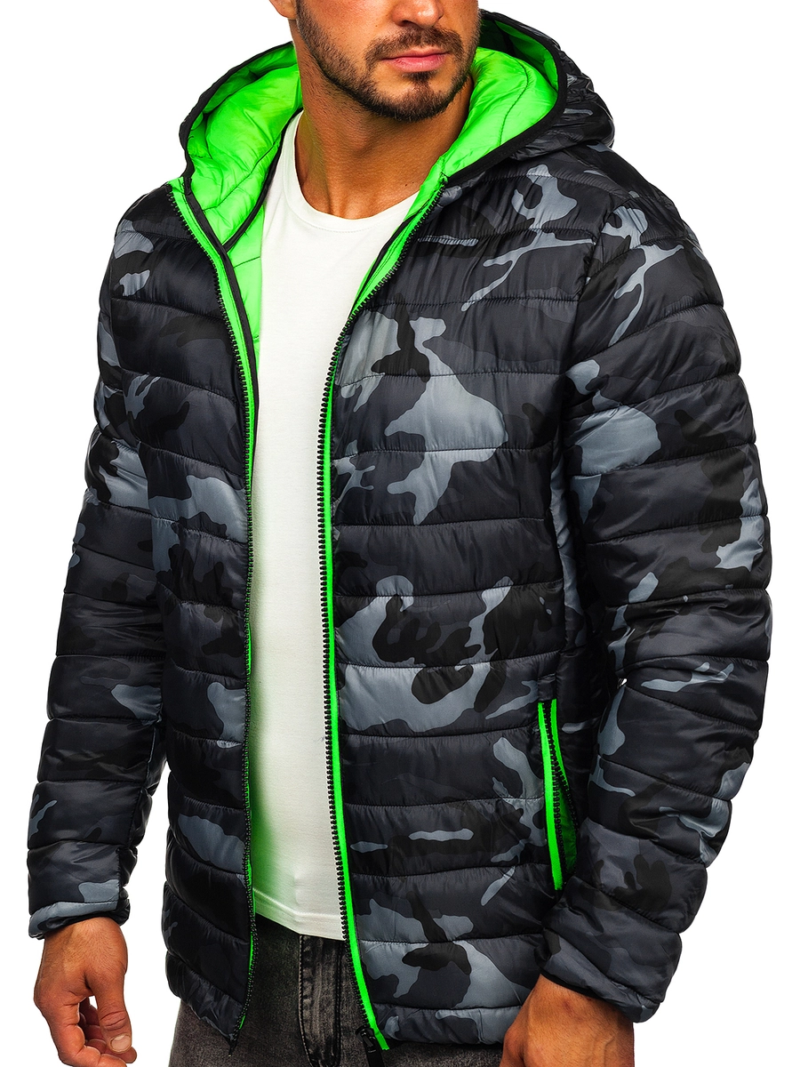 Perfekt svart och grön lättvikts camojacka SM83 för män från Bolf-kollektionen. Den stängs med en dragkedja och har en huva fäst i ståkragen. Jackan i svart och grönt kompletteras av ett extremt moderiktigt kamouflagemönster. Den är vadderad för att ge den en sportig stil. Den har två praktiska ytterfickor med dragkedja. En elastisk mudd nertill och vid ärmsluten gör jackan extra snygg. Den är tillverkad av 100% polyester. En övergångsjacka för de som gillar en sportig stil. Passar perfekt till träning, långa höst-/vinterpromenader eller vandingar. Passar utmärkt med ett par sweatpants, jeans och en T-shirt.