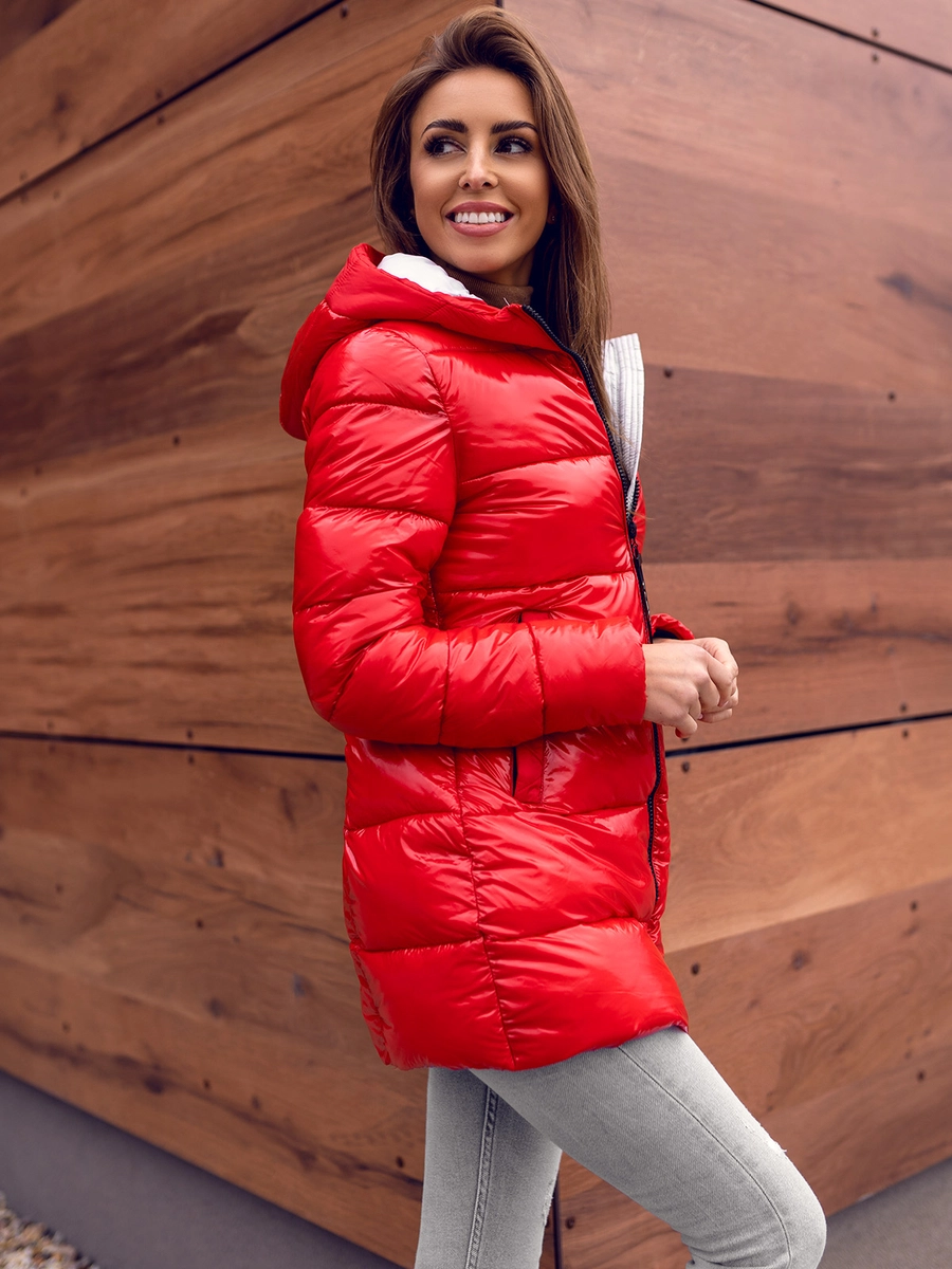 Röd quiltad damvinterjacka med huva B9545 från Bolfs kollektion - perfekt för kalla dagar. Den finns i fem olika färger, vilket ger dig möjligheten att skapa din egen drömstil. Stängs bekvämt med en dragkedja. Den har en ej avtagbar huva och en ståkrage som skyddar bra mot kyla och vind. Hängen på dragkedjorna och små fickor på vänster ärm ger jackan en speciell karaktär. En snygg detalj är den tvärgående quiltningen över hela jackan. Den har två utvändiga fickor med dragkedjor. Jackans lätt utsvängda form nertill och muddarna invändigt på ärmarna gör att den anpassar sig perfekt efter kroppen. Jackan har ett väldigt varmt foder som håller dig varm, skön och behaglig när du använder den. Du kan ha den på promenaden, shoppingturen eller till arbetet. Den vardagliga stilen gör att den passar bra i många olika outfits. Använd gärna med en T-shirt, en tröja och jeans.