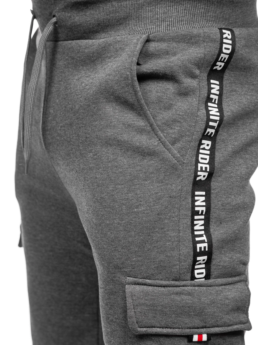 Snygga grafitgrå herr cargosweatpants JX8715 från Bolfs kollektion. Eleganta cargobyxor har varit populära inom herrmodet för årtionden. Byxorna är reglerbara i midjan med resår och dragsko. Tack vare detta passar de bra på de flesta kroppsformer. Bandet på benet i vitt med text kontrasterar bra med färgen på byxorna. De har två praktiska och funktionella fickor. De kan användas till mindre dokument, nycklar eller telefon. Det finns två ytterligare fickor på sidorna. De har lock och ett designtryck. Texten som står på det vita bandet på byxans ben förstärker färgen på plagget. Nertill finns en moderiktig mudd. Det gör att byxan passar benet bra och förhindrar kyla att tränga in under kalla dagar. Den här modellen är tänkte till de som gillar en urban eller sportig stil. Perfekt på träningspasset eller till gymmet. Materialet är flexibelt vilket gör att den passar de allra tuffaste träningspassen. Den klassiska stilen och de dämpade färgerna gör även att byxan passar utmärkt även vid andra tillfällen, så som en kväll ute på stan eller spontana träffar med vännerna. Snygga muddar gör att du kan anpassa byxan till i princip alla andra kläder i din garderob. Dessutom finns byxan i flera olika färger så att du lätt kan matcha den med olika stilar. Ytterligare en fördel är att den är så prisvärd. Det gör att det är en perfekt födelsedagspresent eller julklapp. En sån här byxa passar året runt: höst/vinter, sommar och vår. Byxans mångsidighet gör att den är ett måste i alla mäns garderober. Modellen är (182 cm, 82 kg) och bär storlek XL, men produkten finns i andra storlekar så att du kan hitta en som passar dig. Byxan passar perfekt med en huvtröja, en långärmad top och en sweatshirt.