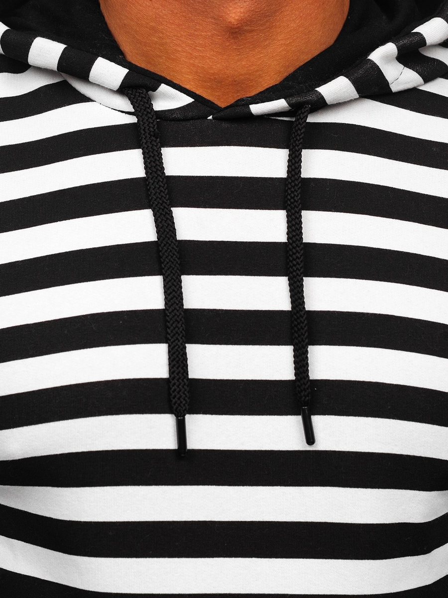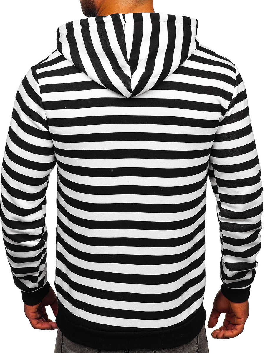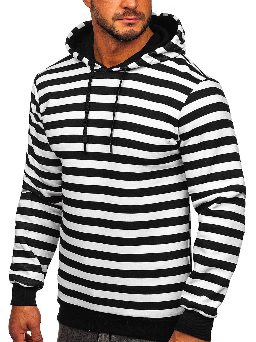 Snygg vit herrhuvtröja med tryck 141029 från Bolfs kollektion. Denna tröja har en justerbar huva i två lager. Nertill och vid ärmsluten finns en mudd vilket gör att den skyddar bra mot kyla. Den är tillverkad av 70 % bomull och 30 % polyester, vilket gör den väldigt mjuk och behaglig. Två sidofickor är ett praktiskt inslag. Den här modellen kännetecknas av dekorativa ränder och finns i tre klassiska färger. Denna huvtröja kommer passa i flera olika sammanhang året runt. Du kan ha den på promenaden, in till stan eller på löpturen. När du ska träffa vännerna, matcha den med jeans, cargobyxor eller joggers. Använd med ett par sweatpants och en lättviktsjacka.