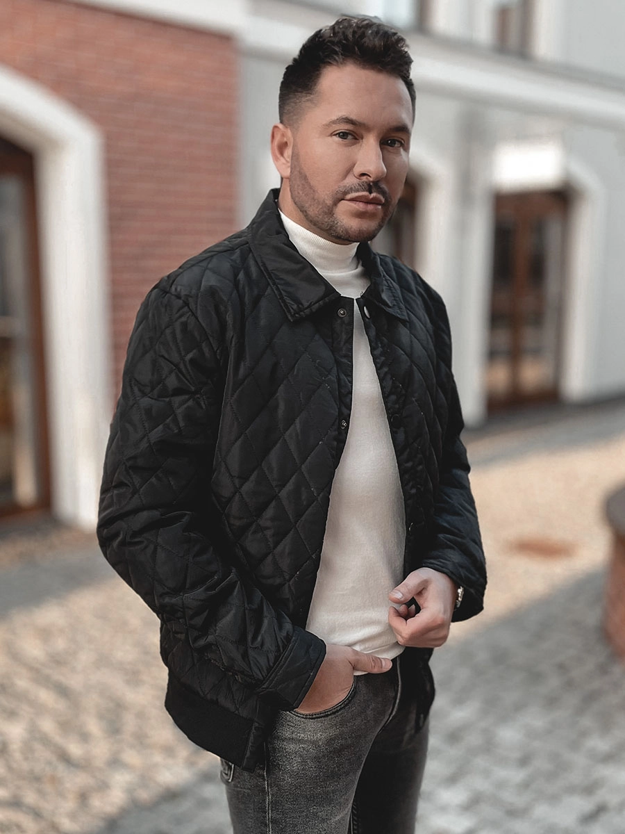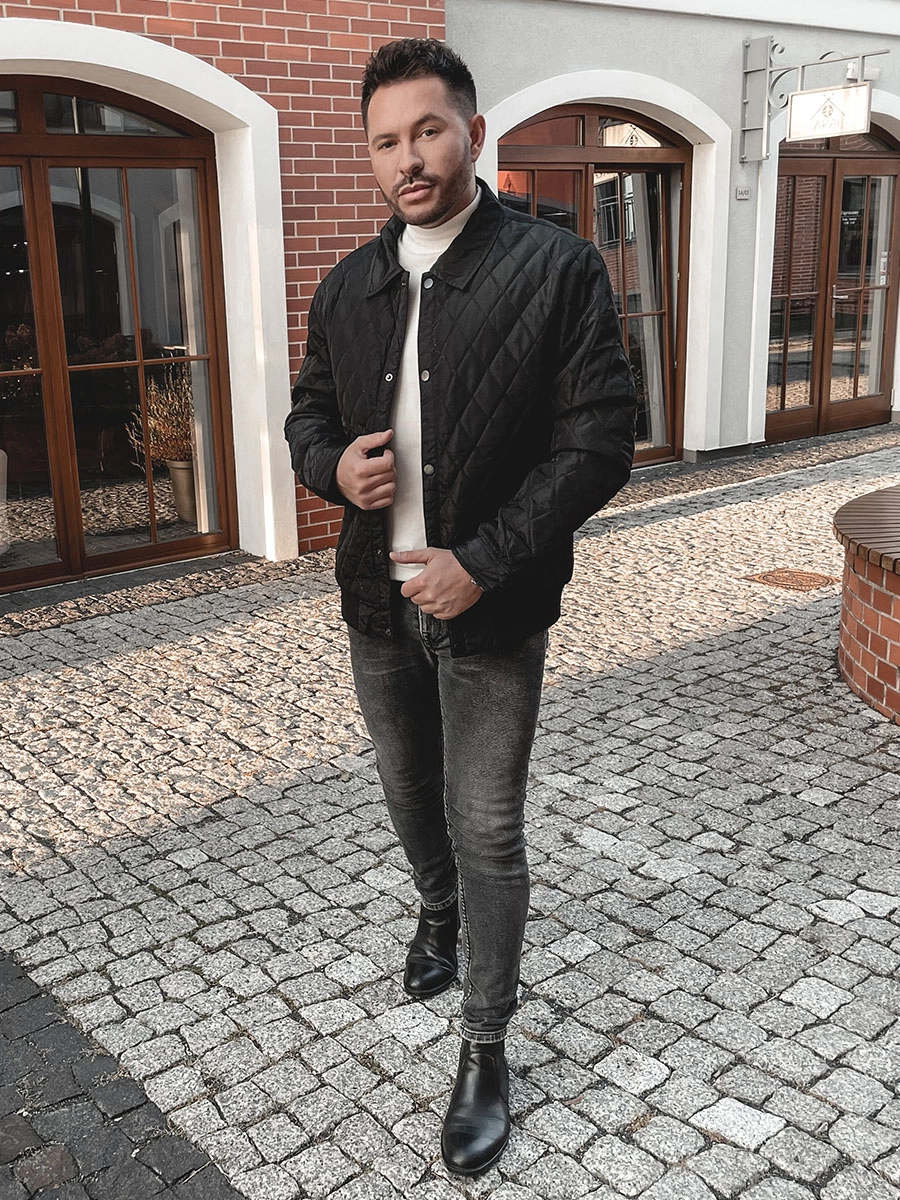 Klassisk svart quiltad herrlättviktsjacka M13081 från Bolfs kollektion. Nertill finns en mudd vilket gör att den skyddar bra mot kyla och anpassar sig bra efter kroppsformen. Rombquiltning över hela jackan ger den en unik, fin karaktär. Den stängs med tryckknappar och har två ytterfickor, även de med tryckknappar. Den har även en invändig ficka. Jackans mångsidighet gör att den kan användas både till sportiga och vardagliga stilar. Perfekt för vardagligt bruk, som shopping eller till morgonjoggen. En stor fördel med jackan är att den är så lätt och bekväm att använda. Skapa din egen unika stil genom att kombinera jackan med chions och en långärmad top.