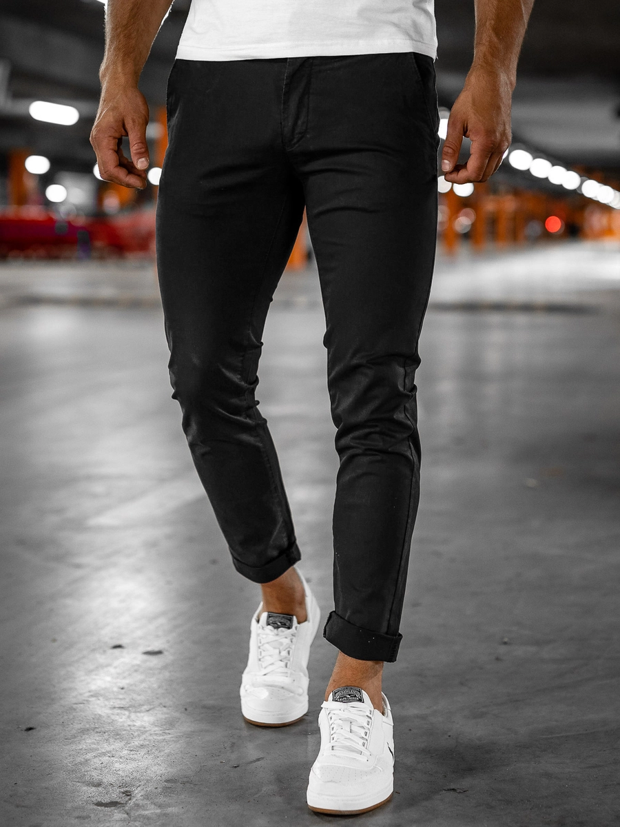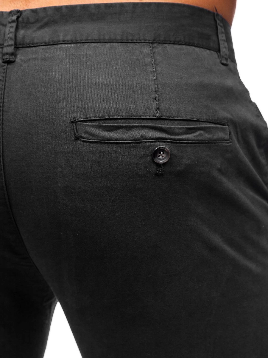 Klassiska och bekväma svarta herr chinobyxor 1146 från Bolf-kollektionen. Klassisk design - ett måste i varje herrgarderob. Den presenterade modellen finns i olika färger och kan användas i flera olika outfits. Denna modell passar perfekt för våren och sommaren. Detta par är tillverkat av andningsbar högkvalitativ bomull. Den har en dragkedja och en knapp. Två sidofickor och en bakficka. Lägg till ett snyggt bälte. Bär dom tillsammans med en skjorta, kavaj, T-shirt eller en långärmad topp.