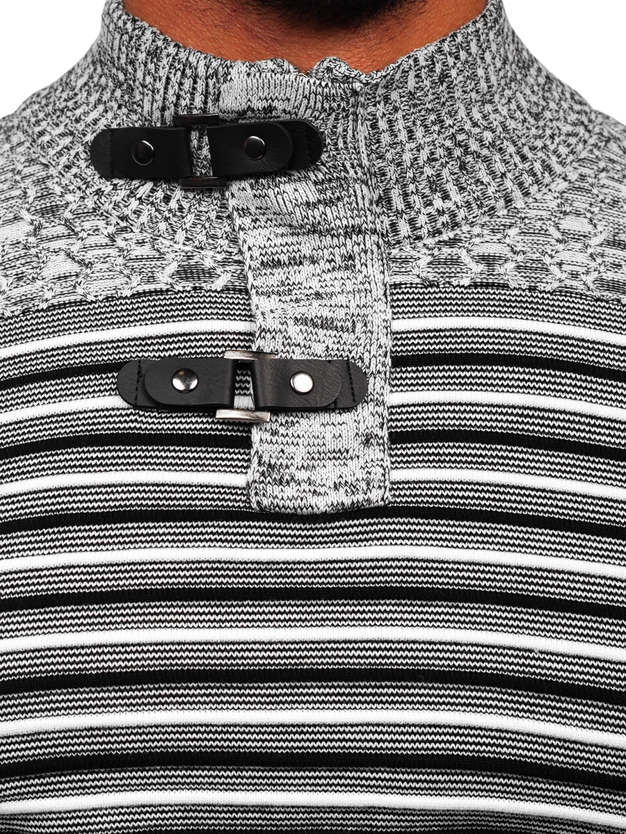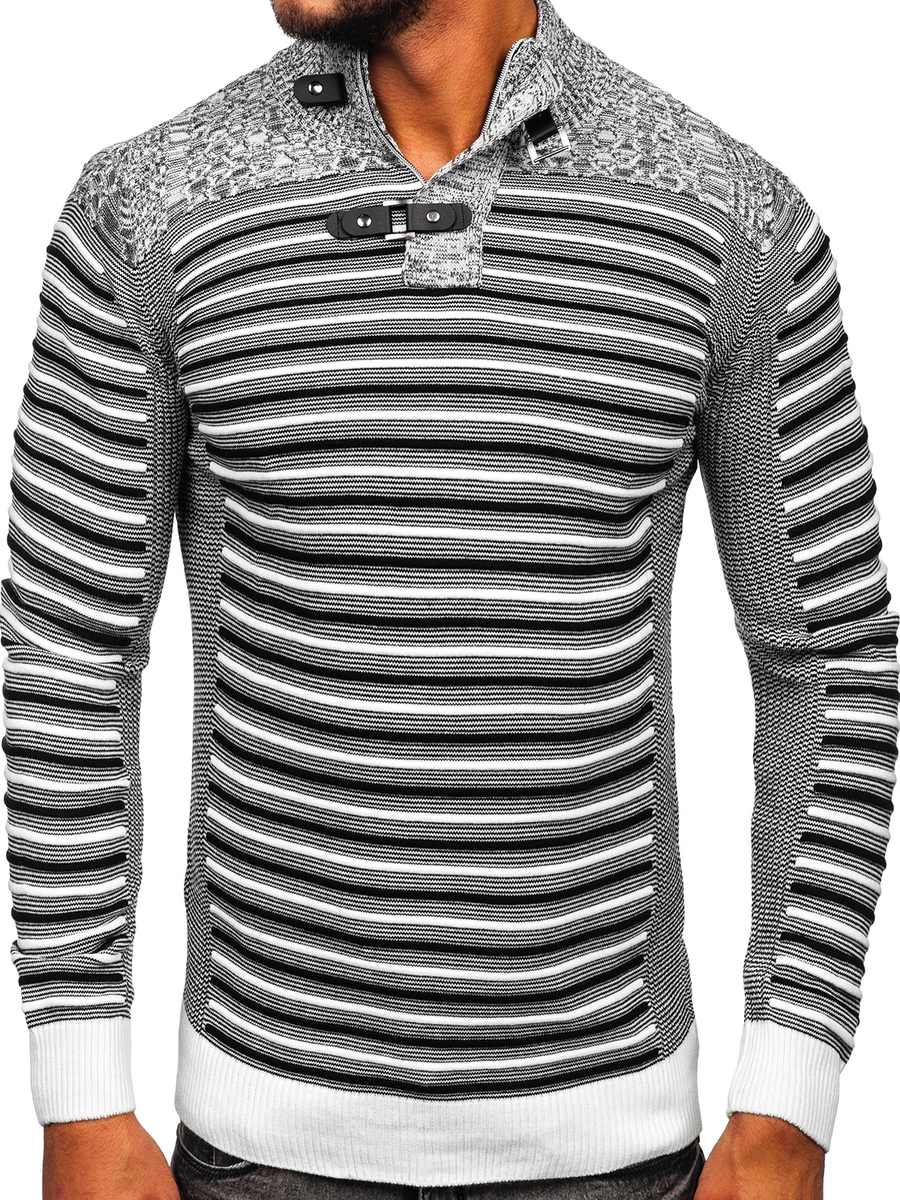 Klassisk vit herrtröja med ståkrage 1028 från Bolfs kollektion. Den har en fin ståkrage och stängs med dragkedja och tryckknappar. Nertill, på halsringningen och på ärmarna finns en ribbning, vilket gör att den passar de flesta kroppsformer och är väldigt bekväm. Den är tillverkad av 50% ull och 50% akryl. Den här modellen finns i fyra olika färger, så du hittar definitivt en som passar. Snygga ränder ger den karaktär. De dämpade färgerna gör att tröjan passar både till ljusare och mörkare outfits. Använd den till skolan, arbetet, på promenaden eller en date - den passar oavsett tillfälle. Du kan använda den ihop med joggers och en bomberjacka för att skapa en ledig look på kvällspromenaden. En klassisk tröja passar utmärkt med chinos och en skinnjackaför att skapa den perfekta outfiten när du ska träffa dina vänner.