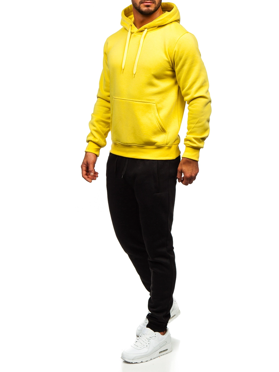 Fantastisk ljusgul sportig herrträningsoverall D002-33 från Bolfs kollektion. Setet består av sweatshirt och sweatpants. Huvtröjan har en tidlös känguruficka. Byxorna är reglerbara i midjan med bred resår och dragsko och de har två fickor på sidorna. Ett enkelt snitt med bra passform ger dem ett sportigt utseende. Den är tillverkad av mjukt och skönt material för en god bekvämlighet. En träningsoverall kan vara en perfekt bas för en vardalig eller sportig outfit. Både tröjan och byxorna kan kombineras med olika kläder, vilket gör dem väldigt användbara i dina vardagliga outfits. Setet passar perfekt med en T-shirt, en lättviktsjacka eller en sportjacka. Träningsoverallen rekommenderas att användas hemma, på promenaden, på shoppingturen eller när du tränar på gymmet eller ute i naturen.