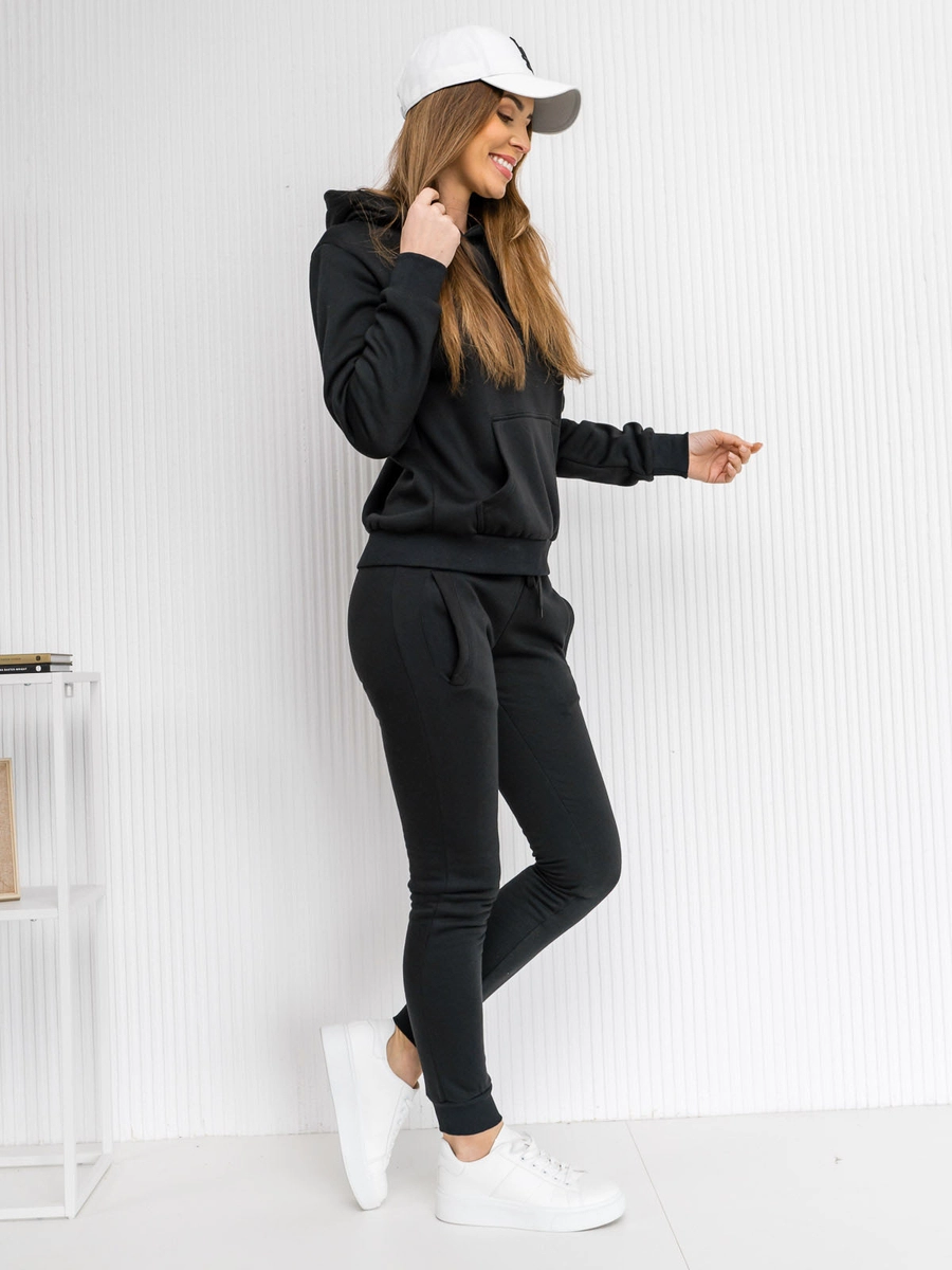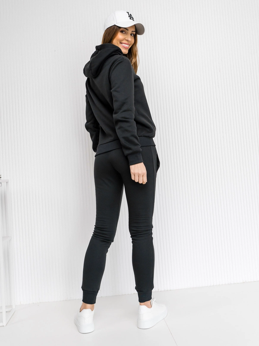 En "måste-ha" svart damträningsoverall 20382 från Bolfs kollektion. Setet består av sweatshirt och sweatpants. Den har en elastisk mudd på ärmarna och nertill. Denna tröja har en justerbar huva och en känguruficka. Byxorna är reglerbara i midjan med resår och dragsko. Två utvändiga fickor ger en praktisk karaktär. Den är tillverkad av mjukt och skönt material för en god bekvämlighet. Ett enkelt snitt med bra passform ger dem ett sportigt utseende. En träningsoverall kan vara en perfekt bas för en vardalig eller sportig outfit. Både tröjan och byxorna kan kombineras med olika kläder, vilket gör dem väldigt användbara i dina vardagliga outfits. Setet kan gärna matchas med en sweatshirt med dragkedja och en T-shirt.