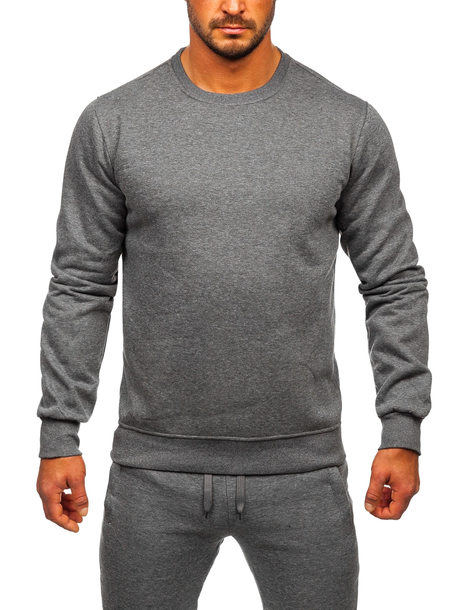Fantastisk antrazitgrå sportig herrträningsoverall 10380 från Bolfs kollektion. Setet består av sweatshirt och sweatpants. Byxorna är reglerbara i midjan med bred resår och dragsko och de har två fickor på sidorna. Ett enkelt snitt med bra passform ger dem ett sportigt utseende. Den är tillverkad av mjukt och skönt material för en god bekvämlighet. En träningsoverall kan vara en perfekt bas för en vardalig eller sportig outfit. Både tröjan och byxorna kan kombineras med olika kläder, vilket gör dem väldigt användbara i dina vardagliga outfits. Setet passar perfekt med en T-shirt, en lättviktsjacka eller en sportjacka. Träningsoverallen rekommenderas att användas hemma, på promenaden, på shoppingturen eller när du tränar på gymmet eller ute i naturen.