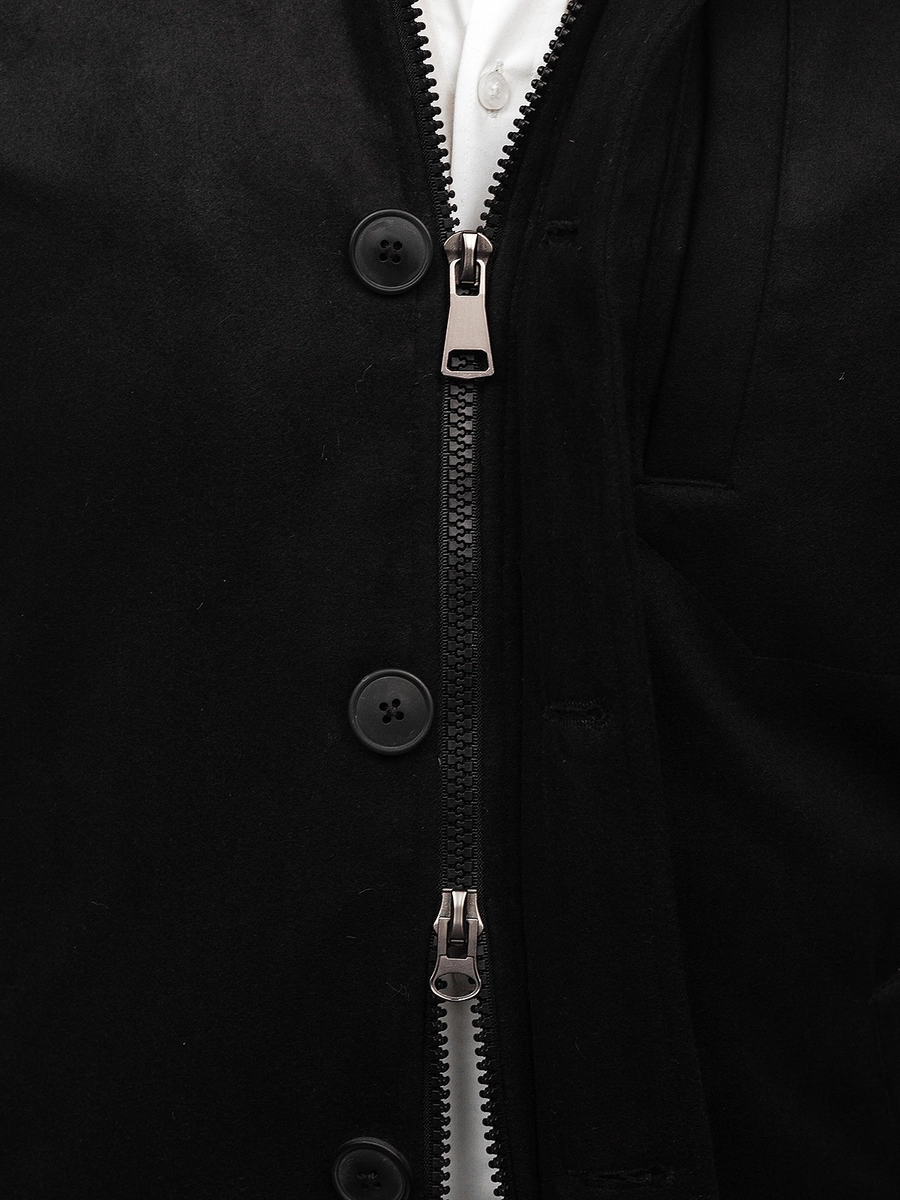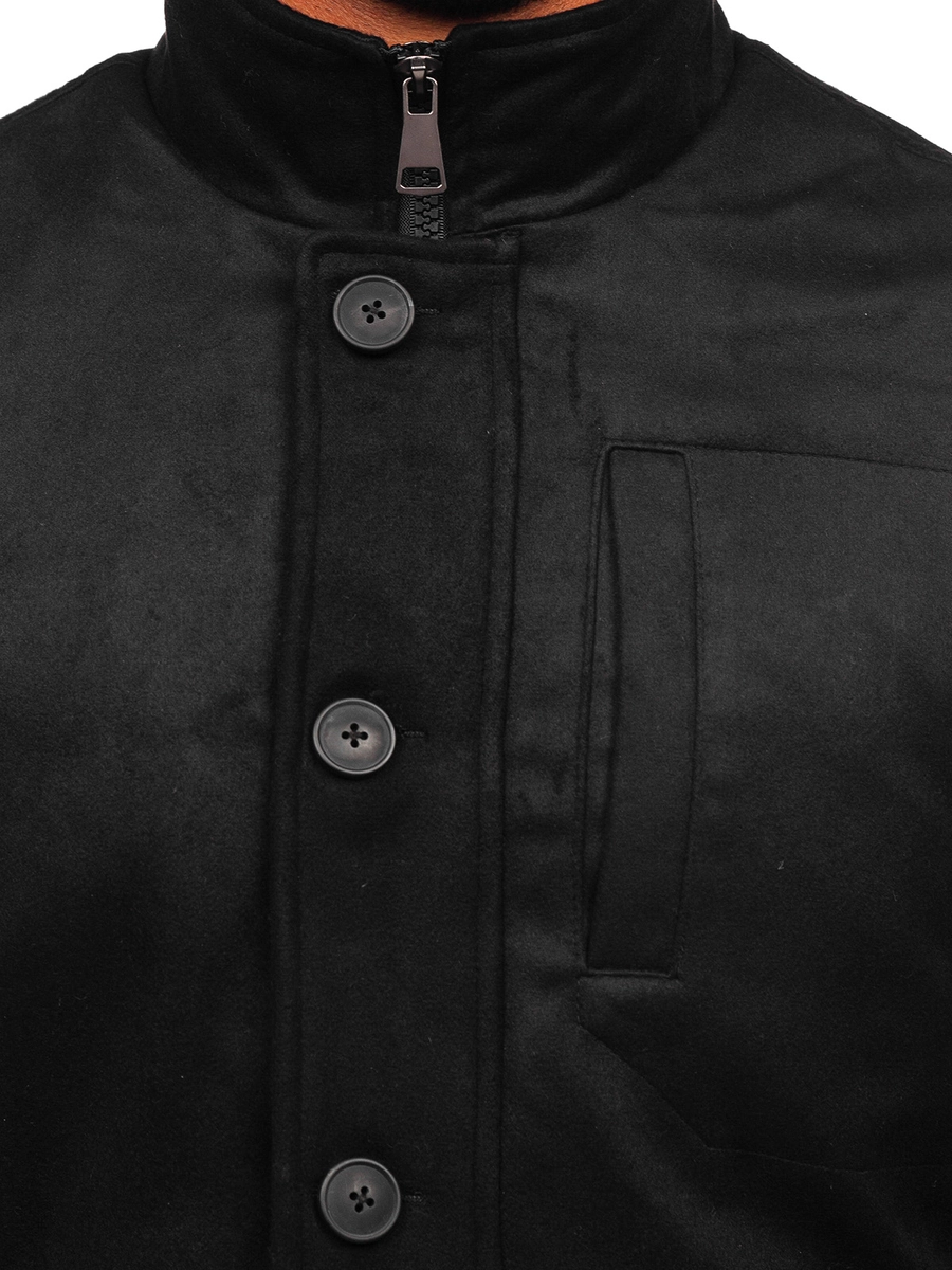 Svart herrvinterrock med ståkrage M3129 från Bolfs kollektion. Den stängs med dragkedja och knappar. Den har en ståkrage, två utvändiga fickor och en bröstficka. Den har även en invändig ficka. Ett dekorativt inslag är ett spänne med knappar på ärmarna. Ser snygg ut både knäppt och öppen. Den är tillverkad i material av hög kvalitet. Den är väldigt originell men har samtidigt en tidlös elegans. Perfekt ihop med chinos, en skjorta och en jacka, för en mer formell stil. Du kan använda den med jeans och en tröja för en passande outfit på kvällspromenaden.