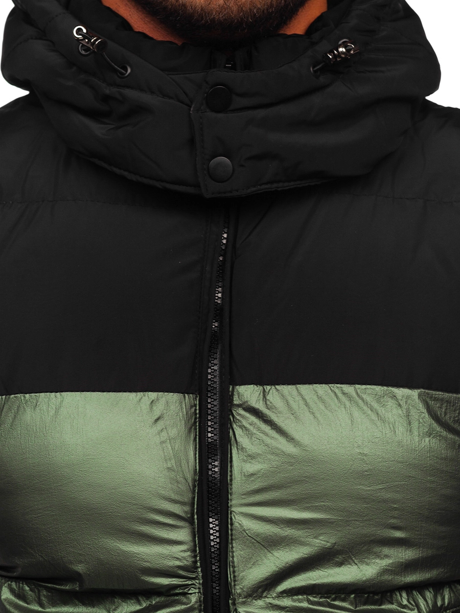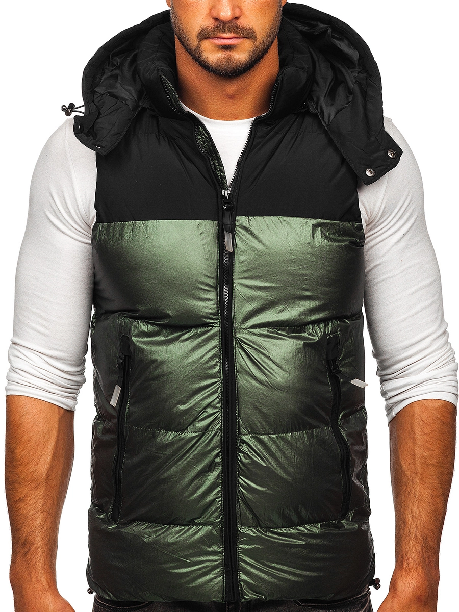 Snygg quiltad grön herrväst med huva 13079 från Bolfs kollektion. Västen har en dragkedja, en avtagbar huva och ståkrage - tack vare dessa är den ett väldigt praktiskt plagg. Den har två utvändiga fickor med dragkedja och en invändig ficka där du kan förvara de mest värdefulla sakerna, som din telefon, plånbok eller nycklar. Västen finns i flera olika färger och har en sportig, enkel stil. Västen är perfekt för män som gillar sportaktiviteter. Du kan även använda den dagligen när du ska in till stan, träffa vänner eller gå en promenad. Skapa en perfekt match med en långärmad top eller ett par joggers. Passar utmärkt med en sweatshirt och jeans.